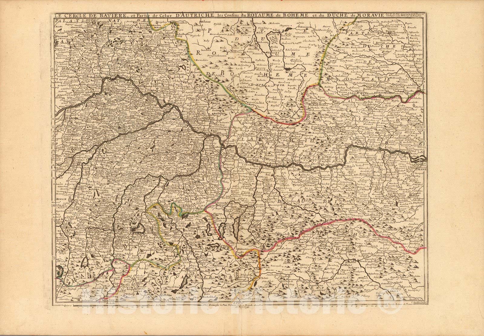 Le Cercle de Baviere, et Partie de Celuy D'Austriche les Confins du Royaume de Boheme et du Duche de Moraviie. | Atlas ou Recueil de Cartes Geographiques Dressees Sur les Nouvelles Observations de Mrs. de L'Academie Royale des Sciences Par N. de Fer, Geographe de sa Majeste Catolique et de Monseigneur le Dauphin. A Paris chez l'Auteur dans l'Isle du Palais sur le Quay de l'Orloge a la Sphere Royal, avec privilege du Roy 1709. | Pastoureau describes this large atlas as De Fer's folio atlas. It is described by De Fer in his catalog of 1716 as his highly detailed atlas showing all parts of the world, with all the maps available separately. The collation of the atlas seems to vary by copy - our copy has a title page but no table of contents. Our copy collates to parts of Pastoueau FER II C - FER II D, with our latest map dated 1748. The maps range in date from 1690 to 1748 with most of the maps in the 1700 to 1720 period. All maps are numbered in manuscript. Of special note in our copy is the two sheet map of the Mississippi River which is rare to find with both north and south sheets present.