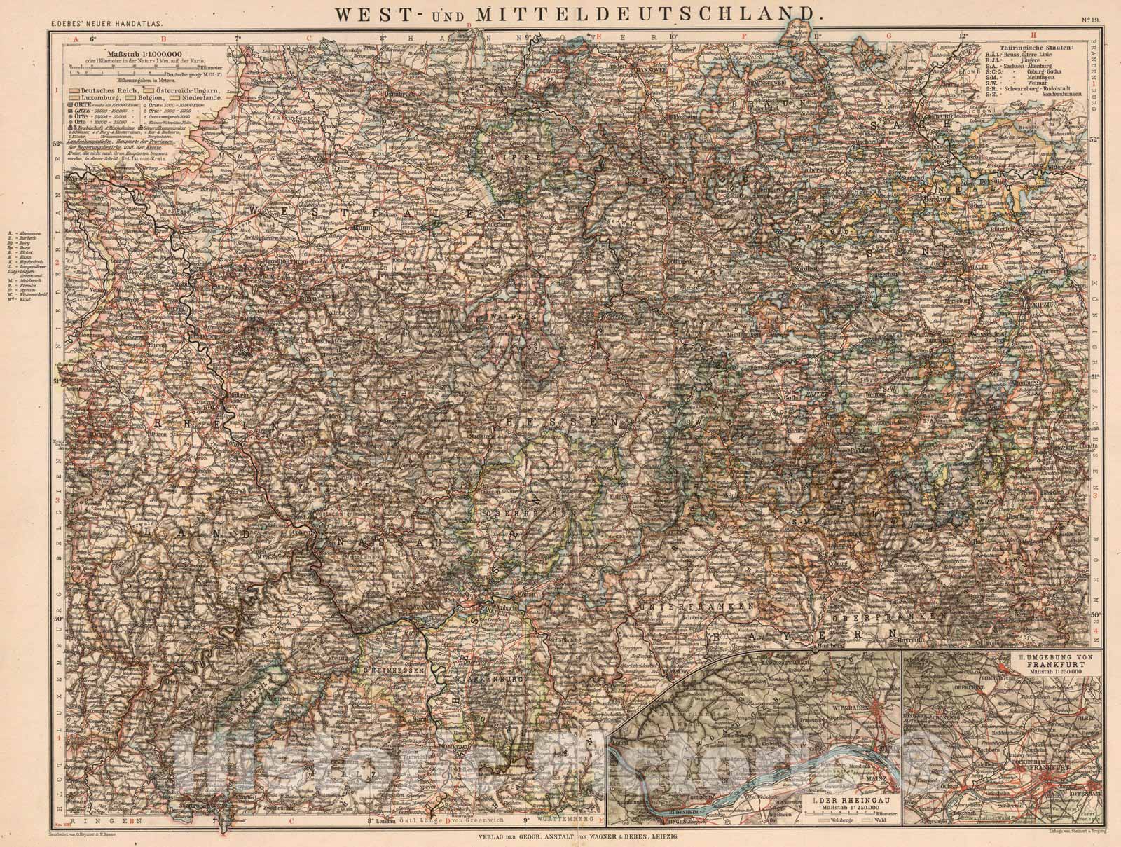 West - und Mittel-Deutschland. Bearbeitet von C. Heymer und P. Bosse. Lithogr. von Steinert & Irrgang. Verlag der Georg. Anstalt von Wagner & Debes, Leipzig. (to accompany) Neuer Handatlas uber alle Teile der Erde.1899. No. 19 (with 2 insets). | Neuer Handatlas uber alle Teile der Erde. In 61 Haupt- und 124 Nebenkarten mit alphabetischen Namenverzeichnis. Herausgegeben von E. Debes. Zweite vermehrte un verbesserte Auflage. Leipzig, H. Wagner & E. Debes, 1899. | Second and revised edition of E. Debes' Neuer Hand Atlas, published in 1899, reflects the latest available data of physical and topographical geography available. It contains 61 double page maps, table of contents and an alphabetical index at the end of atlas. The principal alterations and additions to this atlas are a new physical map of Europe, showing the elevations of the land and depths of the sea, and a map of the Mediterranean sea and the surrounding countries, on which all steamer routes, railways, and telegraph lines are laid down, with three insets illustrating meteorology and botany of the Mediterranean basin. The maps which appeared in the 1st edition in 1895, have been corrected and brought up to date, and the indexes which followed each map have been superseded by a general index at the end of the atlas. Bound in half leather, dark blue hard cover, large gold embossing decoration and title " E. Debes' Neuer handatlas".