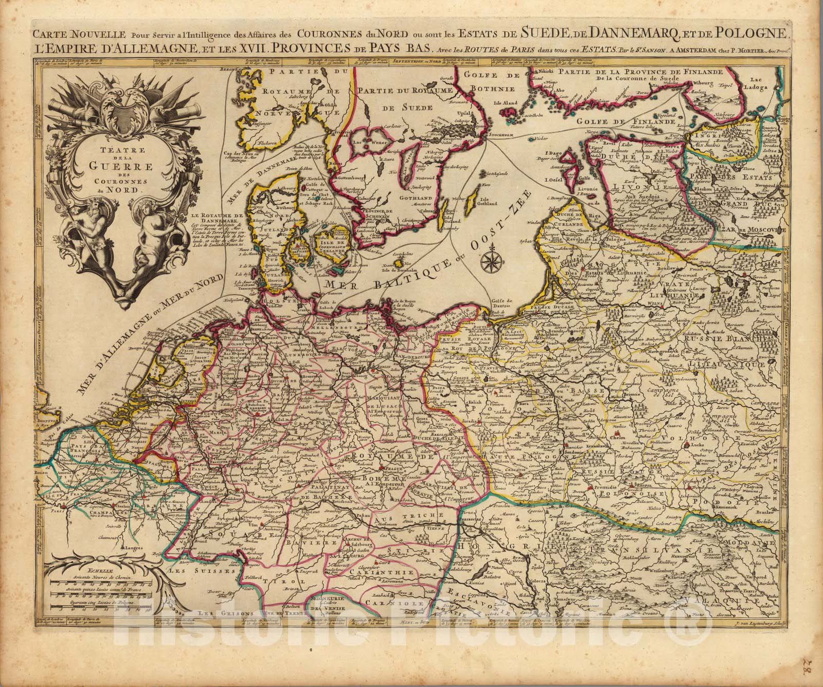Teatre de la Guerre des Couronnes du Nord. | Atlas Nouveau Contenant Toutes Les Parties du Monde, ou Sont exactement Remarques Les Empires, Monarchies, Royaumes, Estats, Republiques & Peuples qui fy trouuent a present. Par le Sr. Sanson, Geographe ordinaire du Roy. Presente a Monseigeur le Dauphin ... Hubert Jaillot Geographe du Roy. A Paris, Chez Hubert Jaillot .... | This issue of the Mortier/Jaillot Atlas Nouveau has 169 maps (1 more than the normal count of 168) plus diagrams, text pages, decorated titles and index pages. It is noted for the large number of multi-sheet "Theatre de la Guerre" (Theater of War) maps covering the battles raging in Europe and the Americas during the Spanish War of Succession (1701-1713) and the Northern War (1700-1721). The Atlas Nouveaux was first published by Jaillot in Paris in 1681(46 maps) with later issues by him in 1684 (72 maps) and 1689 (80 maps). In 1692 Pierre Mortier published his first edition of the Jaillot atlas with 99 maps, another edition followed in 1696 with 111 maps. In 1707/1708 Mortier issued our edition with 168 maps. Later editions by Mortier expanded the atlas even further - 1708, 200 maps; ca 1721, 300 maps; ca 1735, 400 maps. The atlas maps are large folio size with most maps made of two sheets and many maps combining 4 or 6 sheets (those also issued as wall maps separately). The atlas is most impressive for its large size and number of maps as well as being up to date for its time. This copy colored in outline with relief shown pictorially.