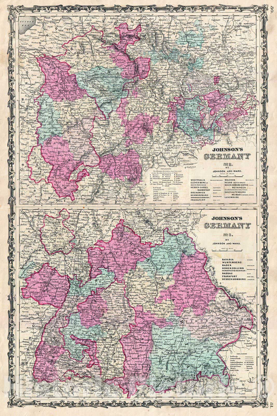 This is A. J. Johnson and Ward's 1862 map of western Germany. Divided into two separate maps. The upper map depicts the states of Westphalia, Clevesberg (Rhein Provinces), Hessen Cassel Darmstadt, Brunswick, Schwarzburg, Frankfurt, Waldeck, Reuss, Saxen Coburg Gotha Meiningen, Saxen Altenburg, Weimar and Luxemburg. The lower map focuses on Bavaria, Wurtenburg, Baden, Frankfurt and Hessen Homburg. Depicting the large and award region of the German Confederation has always been a challenge for Johnson. This is one of Johnson's earliest attempts, dividing the region into four separate maps, Germany 1, 2, and 3, and a separate Prussia sheet. Features the strapwork border common to Johnson's atlas work from 1860 to 1863. Steel plate engraving prepared by A. J. Johnson for publication as page nos.