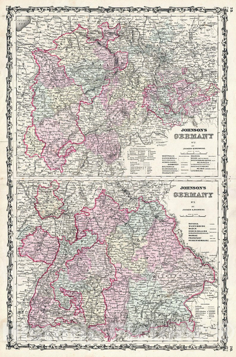 This is a beautiful example of the western sheets from A. J. Johnson and R. Browning's 1861 Germany series. The map is divided into two separate maps within the same border. The upper map depicts the states of Westphalia, Clevesberg (RheProvinces), Hessen Cassel Darmstadt, Brunswick, Schwarzburg, Frankfurt, Waldeck, Reuss, Sain xen Coburg Gotha Meiningen, Sain xen Altenburg, Weimar and Luin xemburg. The lower map focuses on Bavaria, Wurtenburg, Baden, Frankfurt and Hessen Homburg. Depicting the large and awkward range of the German Confederation has always been a challenge for Johnson. This is one of Johnson's earliest attempts, dividing the region into four separate maps, Germany 1, 2, and 3, and a separate Prussia sheet. Various towns, cities, railways, rivers and several other topographical features are noted with relief shown by hachure. It features the strapwork style border common to Johnson's atlas work from 1860 to 1863. Published by A. J. Johnson and Browning as plate nos. 75 and 76 in the 1861 edition of Johnson's New Illustrated Family Atlas. This is the last edition of the Johnson Atlas to bear the 'Johnson and Browning' imprint. Subsequent editions reflect Ward's 1862 acquisition Ross C. Browning's shares in the firm.