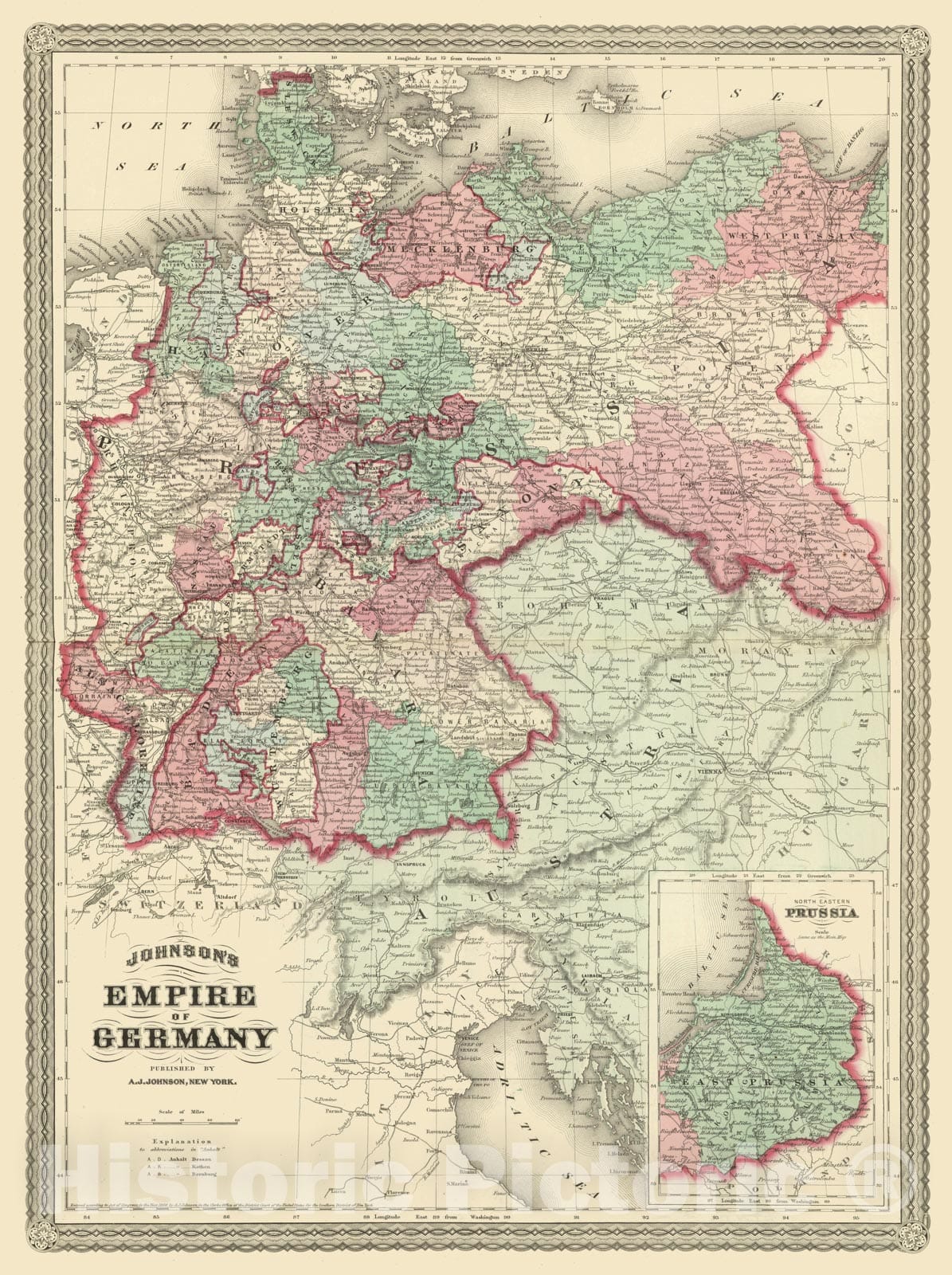 • .Historic Map : Johnson's Empire of Germany. Published by A. J. Johnson, New York. Johnson's Switzerland. Published by A. J. Johnson, New York. 97. 98, 1874 Atlas - Vintage Wall Art