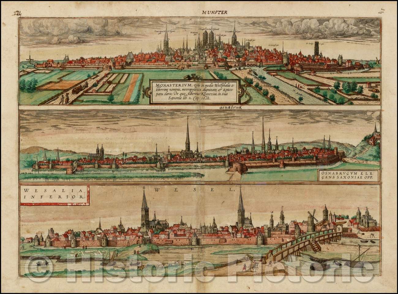 Monasterium Urbs in media Westphalia / Three important Views of Osnabruck, M?nster and Wesel in Northern Germany on a single sheet, 1577