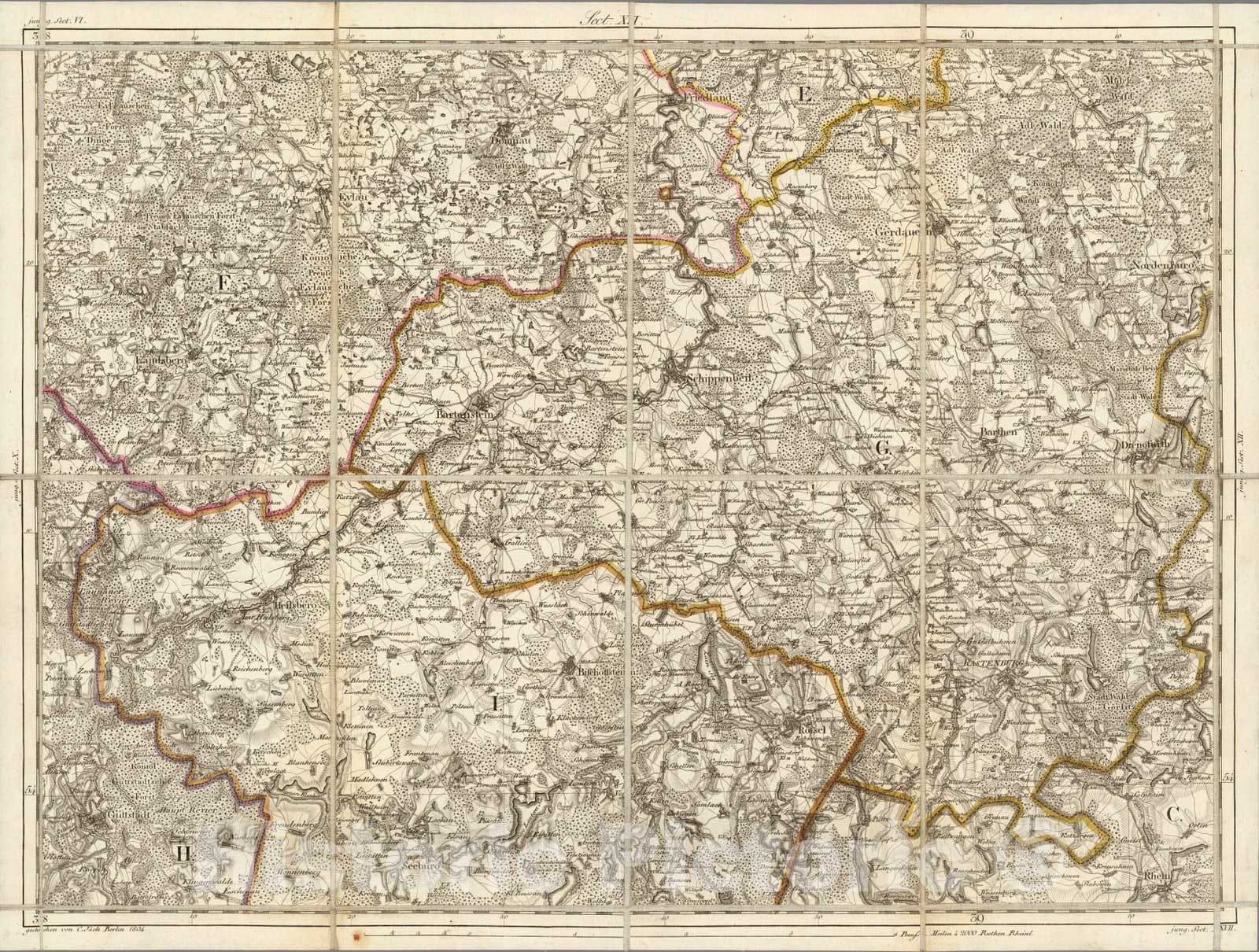 Karte von Ost-Preussen nebst Preussisch Litthauen und West-Preussen nebst dem Netzdistrict aufgenommen unter Leitung des Konigl. Preuss. Staats Ministers Frey Herrn von Schroetteer in den Jahren von 1796 bis 1802. Jack Scripsit et Sculpsit. Sect. XI. Gestchen von C. Jack Berlin 1804. | 12 map on 25 sheets, 200X310, copperplate engraving, hand color, each sheet 41x56, mounted on linen, dated 1802-1810. Placed in card board box, 22x17, with green lable "Karta Schroettera" pasted on lid. Includes portrait of Frederiech Wilhelm III by Meno Sculp. above title. Engraved by: Carl Jack (I-III, V-VII, X-XII, XV, XVI, XVIIII, XXII, 1802-1806), Carl Mare (XIII-XV, XVII, XIX, XXII, XXV, 1806-1810), Heinrich Kliewer (IV, XXIV, 1803), Franz (XX, XXI), Paulus Schmidt (VIII, XXIII, town plans). Map represents a great topographic survey of Germany, Poland and Lithuania, Known as the "Die Schroetterche Landesaufnahme", it is also a highly detailed economic and military map from the era of the Napoleonic Wars and it is important to Prussian annexation of the territory as well as having great utility for administrative purposes. Covers most of the today's Northern Poland, all of the Russian enclave of Kaliningrad Oblast and maritime region of Lithuania.