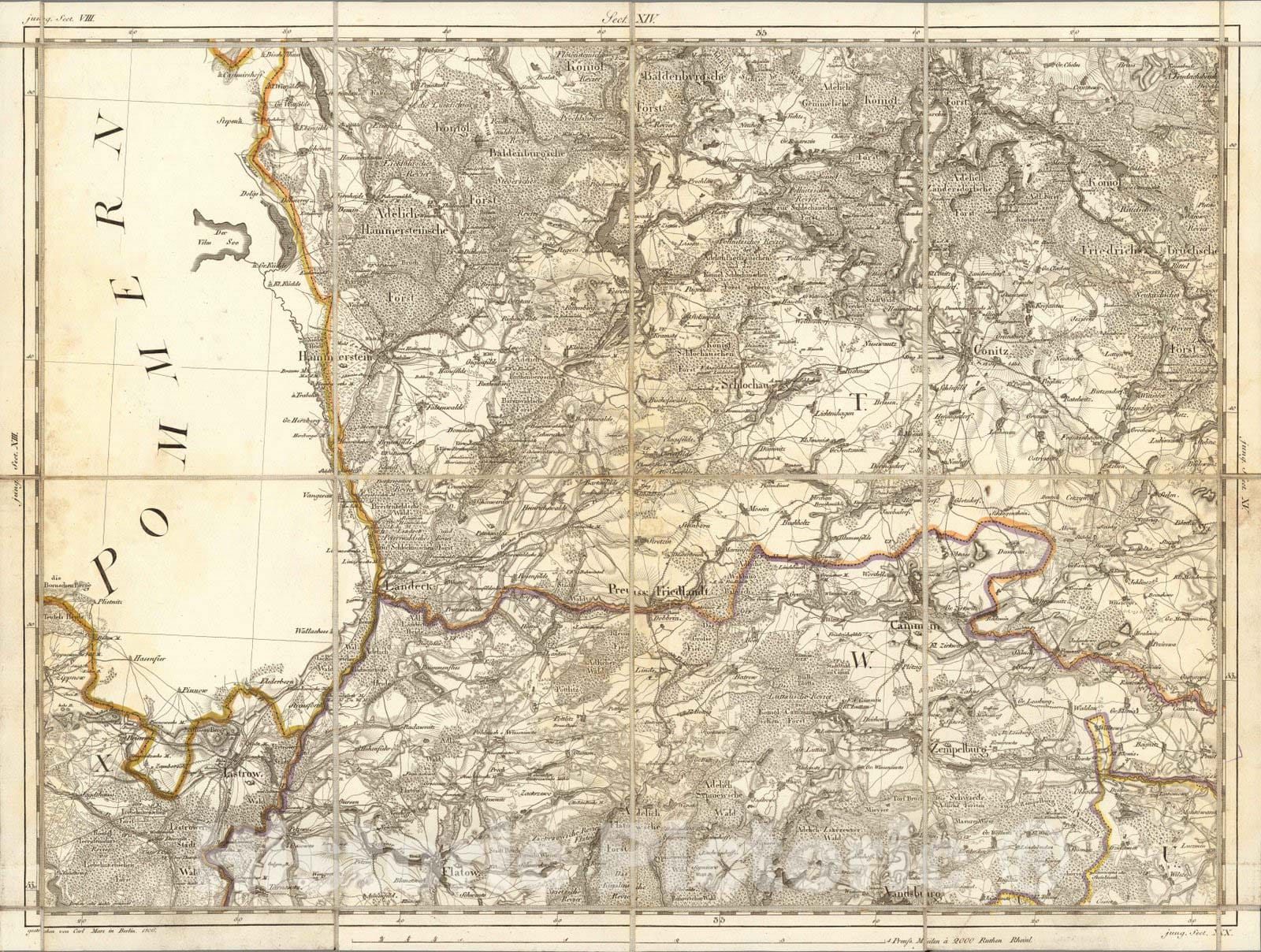 Karte von Ost-Preussen nebst Preussisch Litthauen und West-Preussen nebst dem Netzdistrict aufgenommen unter Leitung des Konigl. Preuss. Staats Ministers Frey Herrn von Schroetteer in den Jahren von 1796 bis 1802. Jack Scripsit et Sculpsit. Sect. XIV. Gestchen von Carl Mare in Berlin 1806. | 8 map on 25 sheets, 200X310, copperplate engraving, hand color, each sheet 41x56, mounted on linen, dated 1802-1810. Placed in card board box, 22x17, with green lable "Karta Schroettera" pasted on lid. Includes portrait of Frederiech Wilhelm III by Meno H Sculp. above title. Engraved by: Carl Jack (I-III, V-VII, X-XII, XV, XVI, XVIIII, XXII, 1802-1806), Carl Mare (XIII-XV, XVII, XIX, XXII, XXV, 1806-1810), Heinrich Kliewer (IV, XXIV, 1803), Franz (XX, XXI), Paulus Schmidt (VIII, XXIII, town plans). Map represents a great topographic survey of Germany, Poland and Lithuania, Known as the "Die Schroetterche Landesaufnahme", it is also a highly detailed economic and military map from the era of the Napoleonic Wars and it is important to Prussian annexation of the territory as well as having great utility for administrative purposes. Covers most of the today's Northern Poland, all of the Russian enclave of Kaliningrad Oblast and maritime region of Lithuania.