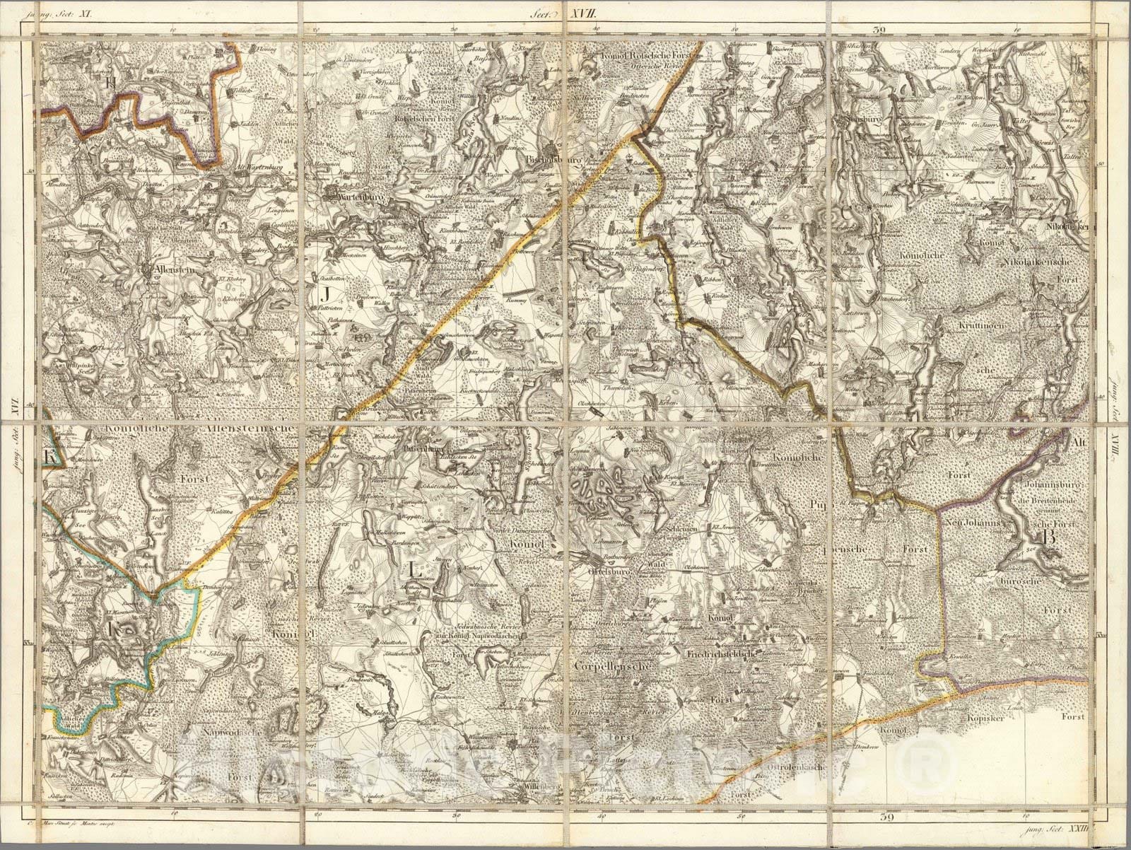 Karte von Ost-Preussen nebst Preussisch Litthauen und West-Preussen nebst dem Netzdistrict aufgenommen unter Leitung des Konigl. Preuss. Staats Ministers Frey Herrn von Schroetteer in den Jahren von 1796 bis 1802. Jack Scripsit et Sculpsit. Sect. XVII. C. Mare, Situat: Sc. Montes except. | 9 map on 25 sheets, 200X310, copperplate engraving, hand color, each sheet 41x56, mounted on linen, dated 1802-1810. Placed in card board box, 22x17, with green lable "Karta Schroettera" pasted on lid. Includes portrait of Frederiech Wilhelm III by Meno H Sculp. above title. Engraved by: Carl Jack (I-III, V-VII, X-XII, XV, XVI, XVIIII, XXII, 1802-1806), Carl Mare (XIII-XV, XVII, XIX, XXII, XXV, 1806-1810), Heinrich Kliewer (IV, XXIV, 1803), Franz (XX, XXI), Paulus Schmidt (VIII, XXIII, town plans). Map represents a great topographic survey of Germany, Poland and Lithuania, Known as the "Die Schroetterche Landesaufnahme", it is also a highly detailed economic and military map from the era of the Napoleonic Wars and it is important to Prussian annexation of the territory as well as having great utility for administrative purposes. Covers most of the today's Northern Poland, all of the Russian enclave of Kaliningrad Oblast and maritime region of Lithuania.