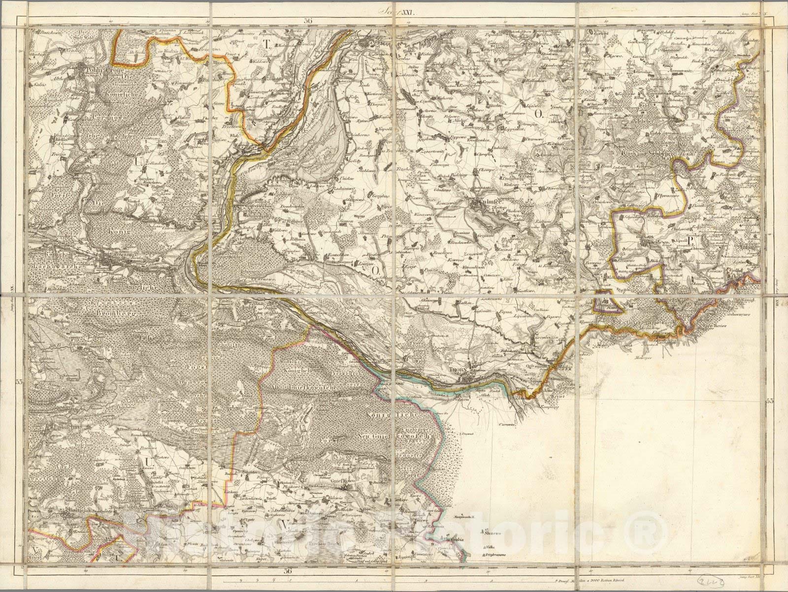 Karte von Ost-Preussen nebst Preussisch Litthauen und West-Preussen nebst dem Netzdistrict aufgenommen unter Leitung des Konigl. Preuss. Staats Ministers Frey Herrn von Schroetteer in den Jahren von 1796 bis 1802. Jack Scripsit et Sculpsit. Sect. XXI. | 20 map on 25 sheets, 200X310, copperplate engraving, hand color, each sheet 41x56, mounted on linen, dated 1802-1810. Placed in card board box, 22x17, with green lable "Karta Schroettera" pasted on lid. Includes portrait of Frederiech Wilhelm III by Meno Sculp. above title. Engraved by: Carl Jack (I-III, V-VII, X-XII, XV, XVI, XVIIII, XXII, 1802-1806), Carl Mare (XIII-XV, XVII, XIX, XXII, XXV, 1806-1810), Heinrich Kliewer (IV, XXIV, 1803), Franz (XX, XXI), Paulus Schmidt (VIII, XXIII, town plans). Map represents a great topographic survey of Germany, Poland and Lithuania, Known as the "Die Schroetterche Landesaufnahme", it is also a highly detailed economic and military map from the era of the Napoleonic Wars and it is important to Prussian annexation of the territory as well as having great utility for administrative purposes. Covers most of the today's Northern Poland, all of the Russian enclave of Kaliningrad Oblast and maritime region of Lithuania.