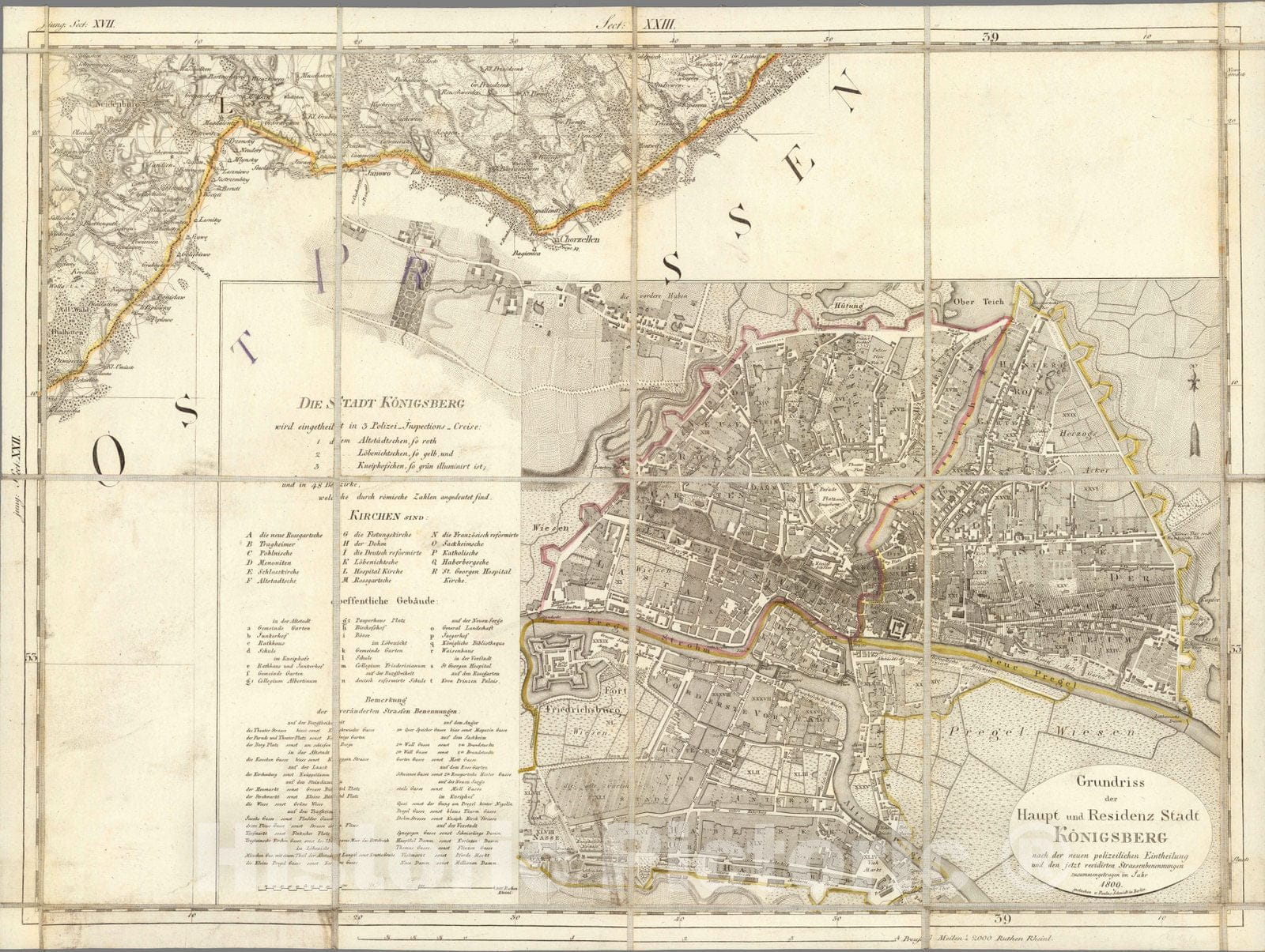 Karte von Ost-Preussen nebst Preussisch Litthauen und West-Preussen nebst dem Netzdistrict aufgenommen unter Leitung des Konigl. Preuss. Staats Ministers Frey Herrn von Schroetteer in den Jahren von 1796 bis 1802. Jack Scripsit et Sculpsit. Sect. XXIII. (inset) Grundriss der Haupt und Residenz Stadt Konigsberg : nach der neuen polizeilichen Eintheilung und den jetzt revidirten Strassen Benennungen. 1809. Gestochen v. Paulus Schmist in Berlin. | 1 map on 25 sheets, 200X310, copperplate engraving, hand color, each sheet 41x56, mounted on linen, dated 1802-1810. Placed in card board box, 22x17, with green lable "Karta Schroettera" pasted on lid. Includes portrait of Frederiech Wilhelm III by Meno Haas Sculp. above title. Engraved by: Carl Jack (I-III, V-VII, X-XII, XV, XVI, XVIIII, XXII, 1802-1806), Carl Mare (XIII-XV, XVII, XIX, XXII, XXV, 1806-1810), Heinrich Kliewer (IV, XXIV, 1803), Franz (XX, XXI), Paulus Schmidt (VIII, XXIII, town plans). Map represents a great topographic survey of Germany, Poland and Lithuania, Known as the "Die Schroetterche Landesaufnahme", it is also a highly detailed economic and military map from the era of the Napoleonic Wars and it is important to Prussian annexation of the territory as well as having great utility for administrative purposes. Covers most of the today's Northern Poland, all of the Russian enclave of Kaliningrad Oblast and maritime region of Lithuania.