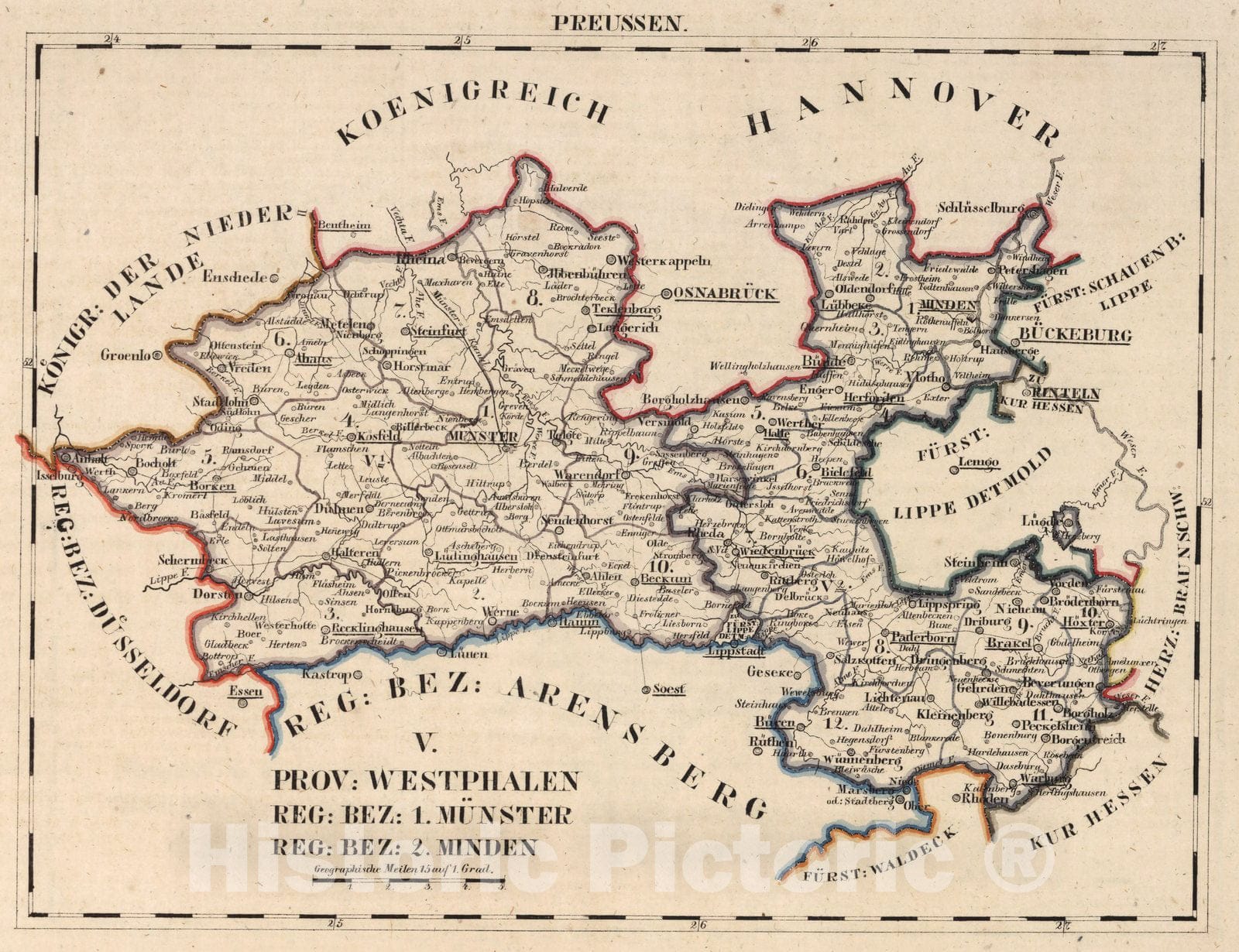 Historic Map : Prussia , Germany, V.2:6-10:X. Preussen. V. Prov: Westphalen. Reg: Bez: 1. Munster. Reg: Bez: 2. Minden 1825 , Vintage Wall Art