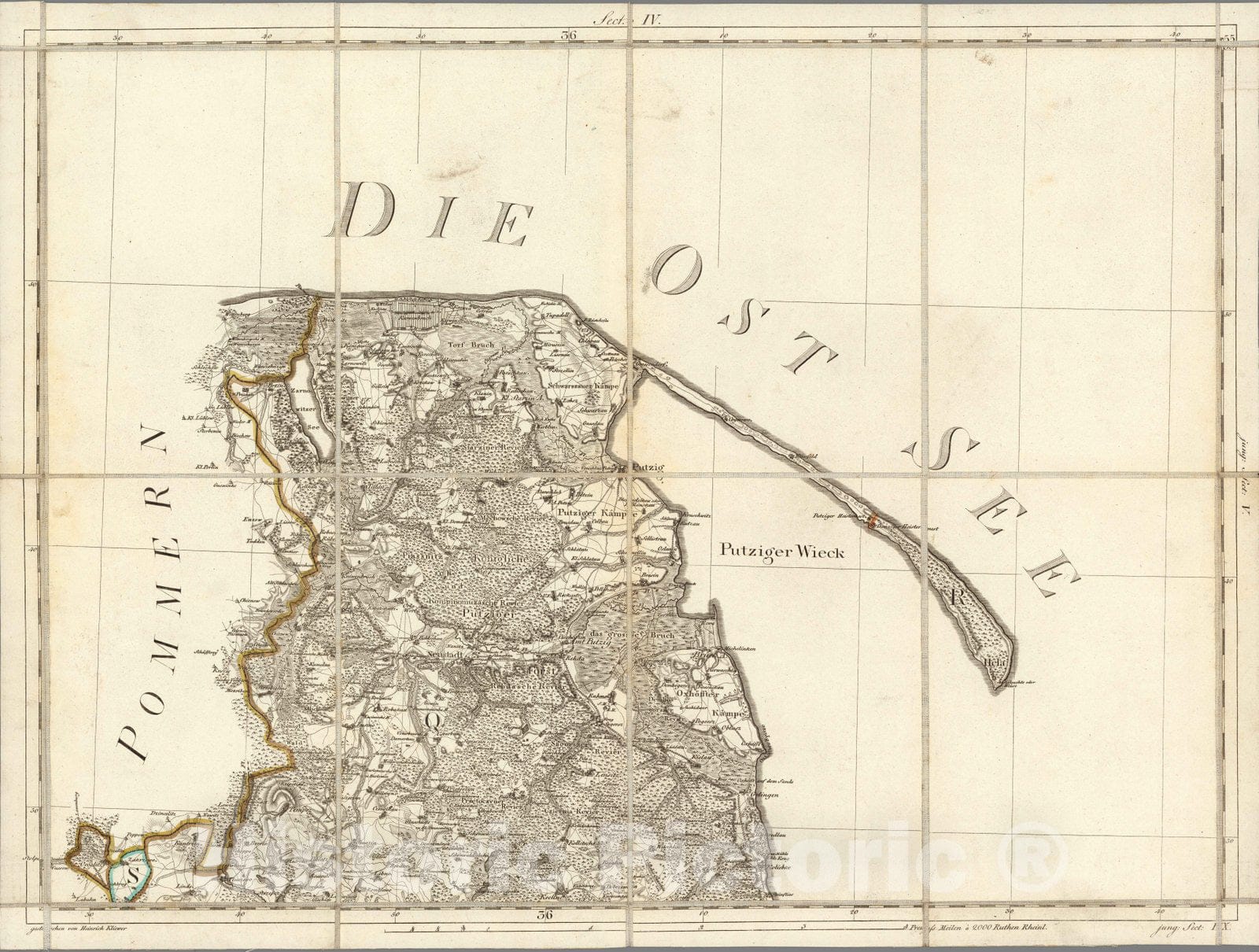 Karte von Ost-Preussen nebst Preussisch Litthauen und West-Preussen nebst dem Netzdistrict aufgenommen unter Leitung des Konigl. Preuss. Staats Ministers Frey Herrn von Schroetteer in den Jahren von 1796 bis 1802. Jack Scripsit et Sculpsit. Sect. IV. Gestchen von Heinrich Kliewer. | 13 map on 25 sheets, 200X310, copperplate engraving, hand color, each sheet 41x56, mounted on linen, dated 1802-1810. Placed in card board box, 22x17, with green lable "Karta Schroettera" pasted on lid. Includes portrait of Frederiech Wilhelm III by Meno Sculp. above title. Engraved by: Carl Jack (I-III, V-VII, X-XII, XV, XVI, XVIIII, XXII, 1802-1806), Carl Mare (XIII-XV, XVII, XIX, XXII, XXV, 1806-1810), Heinrich Kliewer (IV, XXIV, 1803), Franz (XX, XXI), Paulus Schmidt (VIII, XXIII, town plans). Map represents a great topographic survey of Germany, Poland and Lithuania, Known as the "Die Schroetterche Landesaufnahme", it is also a highly detailed economic and military map from the era of the Napoleonic Wars and it is important to Prussian annexation of the territory as well as having great utility for administrative purposes. Covers most of the today's Northern Poland, all of the Russian enclave of Kaliningrad Oblast and maritime region of Lithuania.