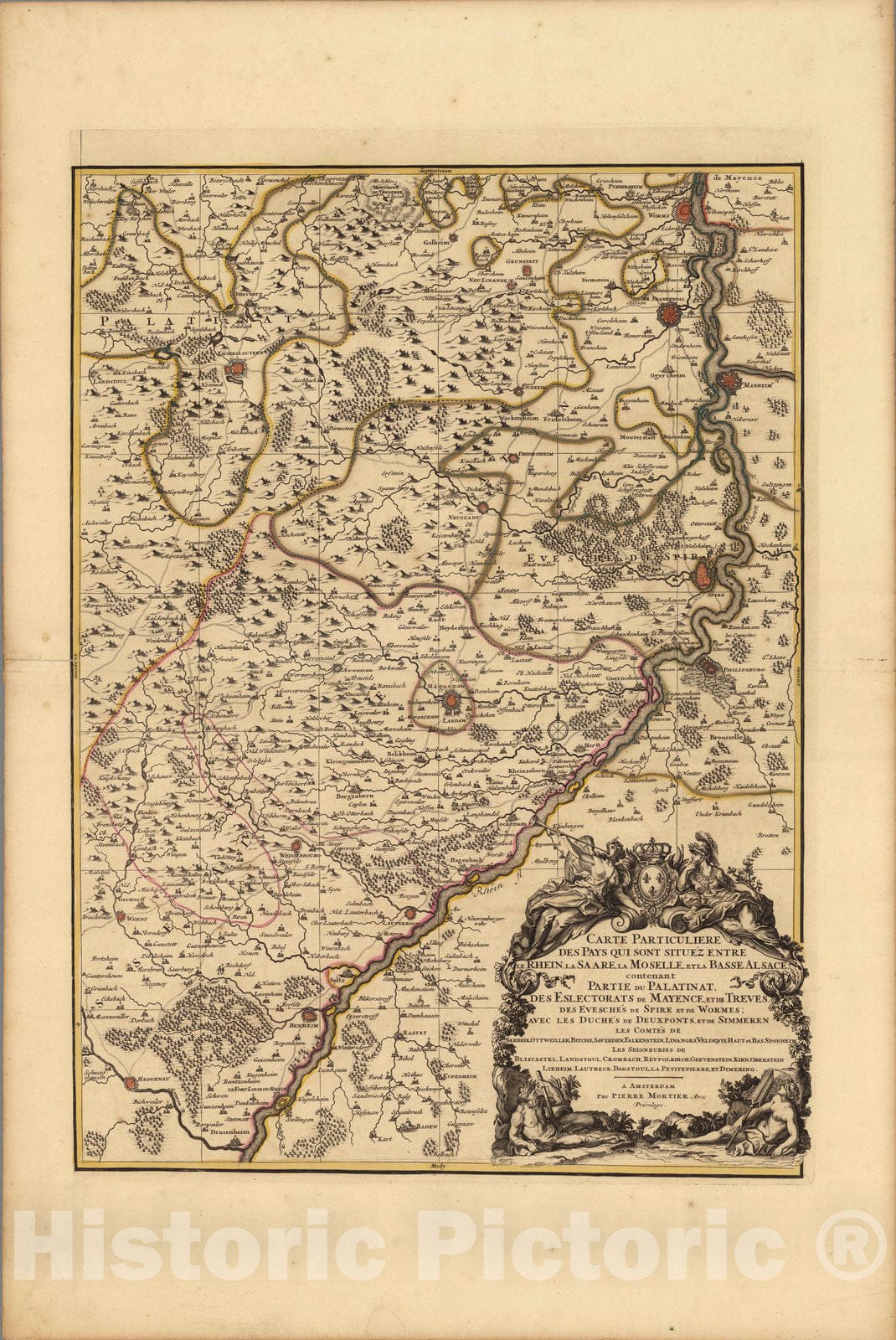 Carte Particuliere des Pays qui sont situez Entre le Rhein, la Saare, la Moselle, et la Basse Alsace. | Atlas Nouveau Contenant Toutes Les Parties du Monde, ou Sont exactement Remarques Les Empires, Monarchies, Royaumes, Estats, Republiques & Peuples qui fy trouuent a present. Par le Sr. Sanson, Geographe ordinaire du Roy. Presente a Monseigeur le Dauphin ... Hubert Jaillot Geographe du Roy. A Paris, Chez Hubert Jaillot .... | This issue of the Mortier/Jaillot Atlas Nouveau has 169 maps (1 more than the normal count of 168) plus diagrams, text pages, decorated titles and index pages. It is noted for the large number of multi-sheet "Theatre de la Guerre" (Theater of War) maps covering the battles raging in Europe and the Americas during the Spanish War of Succession (1701-1713) and the Northern War (1700-1721). The Atlas Nouveaux was first published by Jaillot in Paris in 1681(46 maps) with later issues by him in 1684 (72 maps) and 1689 (80 maps). In 1692 Pierre Mortier published his first edition of the Jaillot atlas with 99 maps, another edition followed in 1696 with 111 maps. In 1707/1708 Mortier issued our edition with 168 maps. Later editions by Mortier expanded the atlas even further - 1708, 200 maps; ca 1721, 300 maps; ca 1735, 400 maps. The atlas maps are large folio size with most maps made of two sheets and many maps combining 4 or 6 sheets (those also issued as wall maps separately). The atlas is most impressive for its large size and number of maps as well as being up to date for its time. This copy colored in outline with relief shown pictorially.