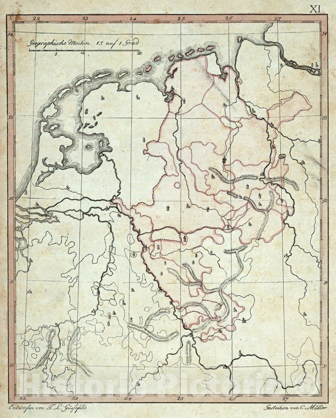Der Westphaelische Kreis (Westphalia District). | A.C. Gaspari. Neuer methodischer Schul-Atlas, entworfen von Franz Ludwig Gussefeld. Erster Cursus. Weimar: Im Verlage des Industrie Comptoirs, 1799. (New methodological School Atlas, designed by Franz Ludwig Gussefeld. First Cursus. Weimar: The publishers of industry Comptoirs, 1799.) | Two largely complimentary volumes bound together and dated 1799 and 1801 respectively. Some maps have scales. Hand colored in outline with little terrestrial information other than relief in hachures, basic hydrography, and product symbols, (see page I for legend). Both volumes were accompanied by text books by Gaspari that were more statistical works than geographies (Espenhorst). Both the atlases and the texts are some of the earliest works published by Gaspari and the publisher, Industrie Comptoirs eventually became the Weimar Geographisches Institut. Several pages stamped, John Cooper Jr., presumably an owner.