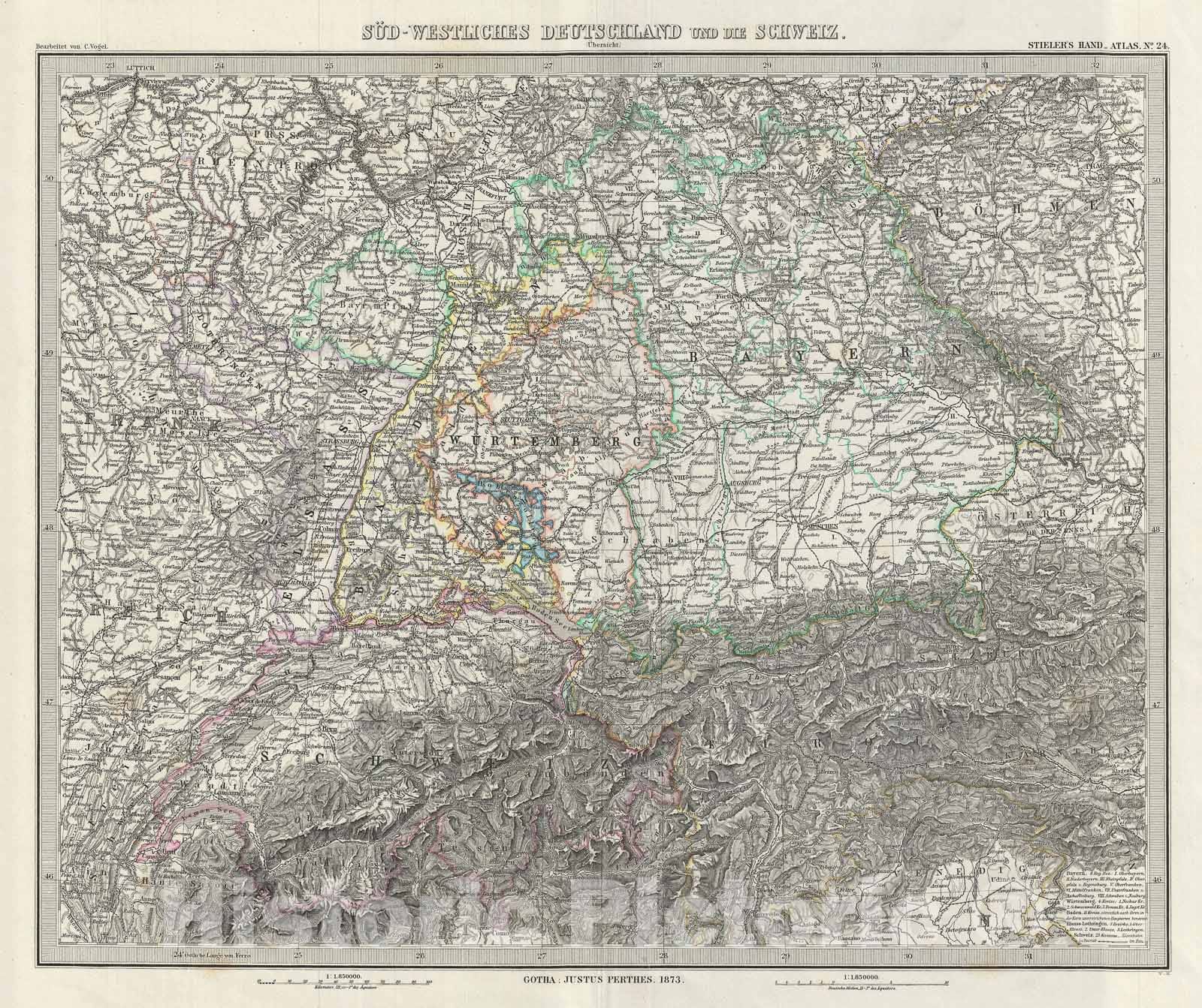 Southwest Germany and Switzerland, Stieler, 1873