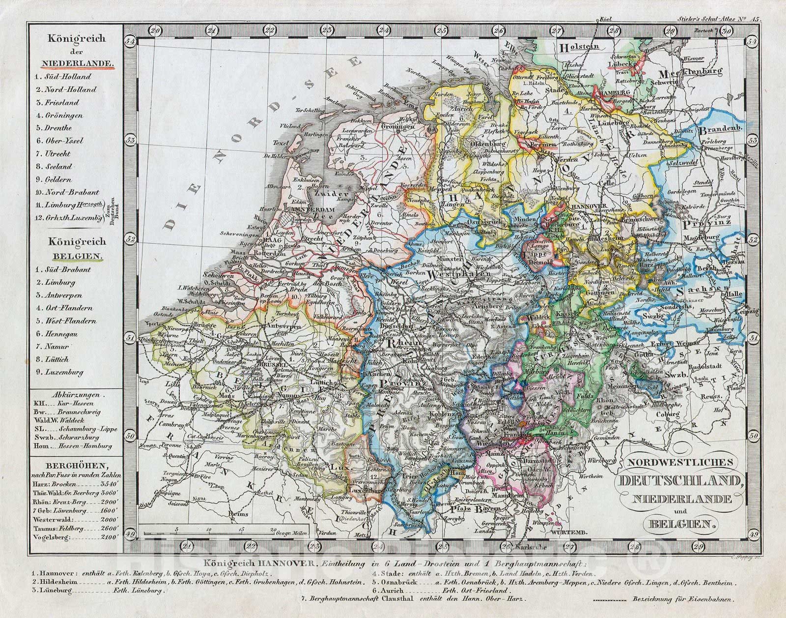 Historic Map : Stieler Map of Holland, Belgium and Western Germany, 1862, Vintage Wall Art