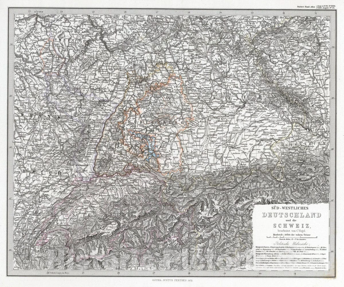 Historic Map : Switzerland; Germany, 1872 Sud-westliches Deutschland und die Schweiz. (Southwest Germany. Switzerland.) , Vintage Wall Art