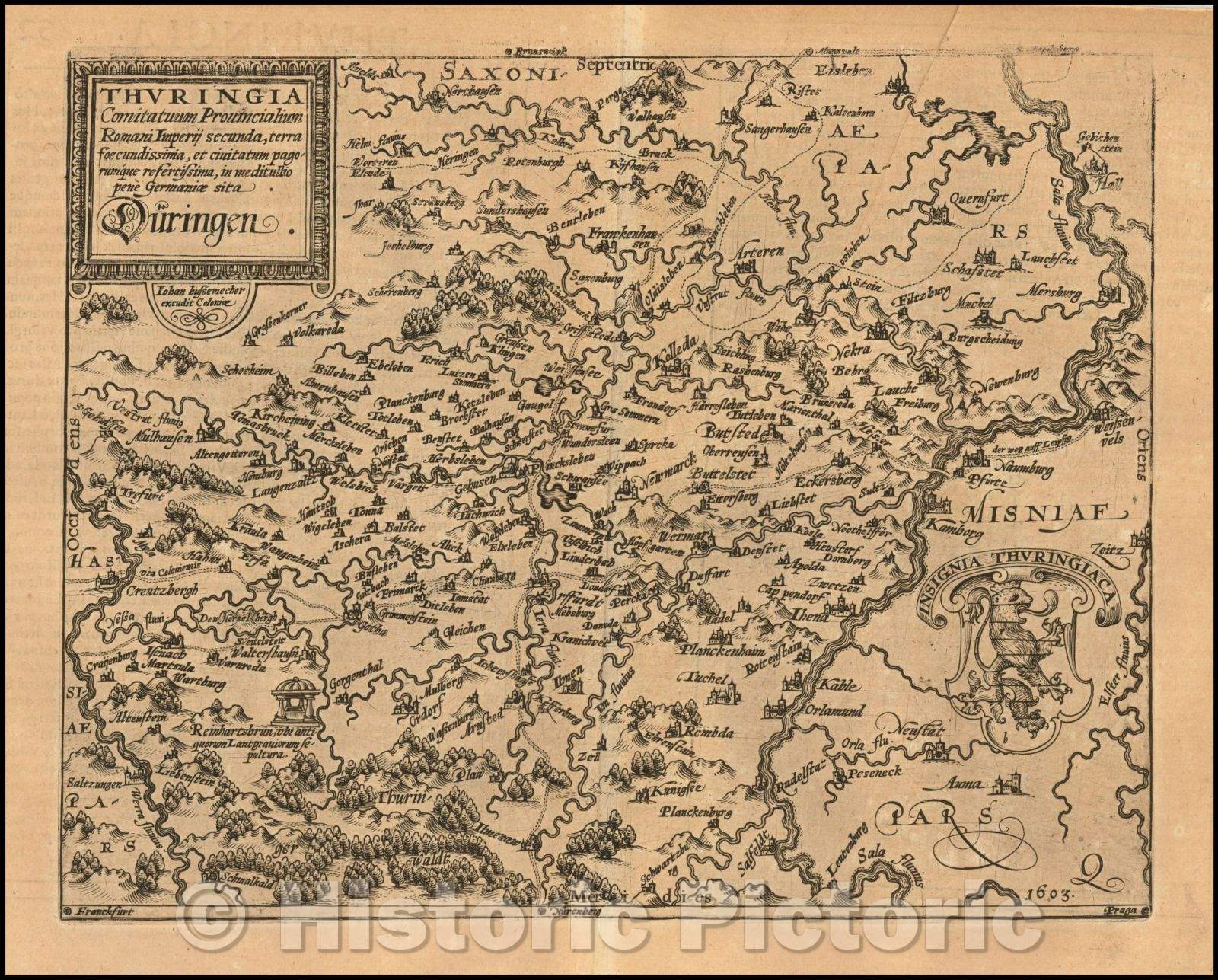 Historic Map - Thuringia Comitatum Provincialium Romani Imperii Secunda, terra foecundissima/Regional Map of Thuringia in Germany, 1592, Matthias Quad - Vintage Wall Art