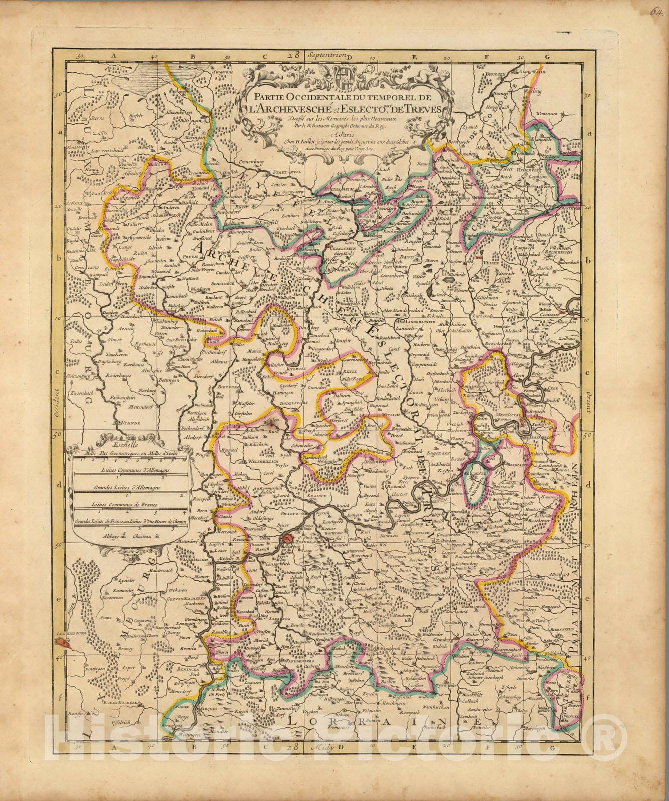 Partie Occidentale du Temporel de L'Archevesche et Eslectorat de Treves. | Atlas Nouveau Contenant Toutes Les Parties du Monde, ou Sont exactement Remarques Les Empires, Monarchies, Royaumes, Estats, Republiques & Peuples qui fy trouuent a present. Par le Sr. Sanson, Geographe ordinaire du Roy. Presente a Monseigeur le Dauphin ... Hubert Jaillot Geographe du Roy. A Paris, Chez Hubert Jaillot .... | This issue of the Mortier/Jaillot Atlas Nouveau has 169 maps (1 more than the normal count of 168) plus diagrams, text pages, decorated titles and index pages. It is noted for the large number of multi-sheet "Theatre de la Guerre" (Theater of War) maps covering the battles raging in Europe and the Americas during the Spanish War of Succession (1701-1713) and the Northern War (1700-1721). The Atlas Nouveaux was first published by Jaillot in Paris in 1681(46 maps) with later issues by him in 1684 (72 maps) and 1689 (80 maps). In 1692 Pierre Mortier published his first edition of the Jaillot atlas with 99 maps, another edition followed in 1696 with 111 maps. In 1707/1708 Mortier issued our edition with 168 maps. Later editions by Mortier expanded the atlas even further - 1708, 200 maps; ca 1721, 300 maps; ca 1735, 400 maps. The atlas maps are large folio size with most maps made of two sheets and many maps combining 4 or 6 sheets (those also issued as wall maps separately). The atlas is most impressive for its large size and number of maps as well as being up to date for its time. This copy colored in outline with relief shown pictorially.