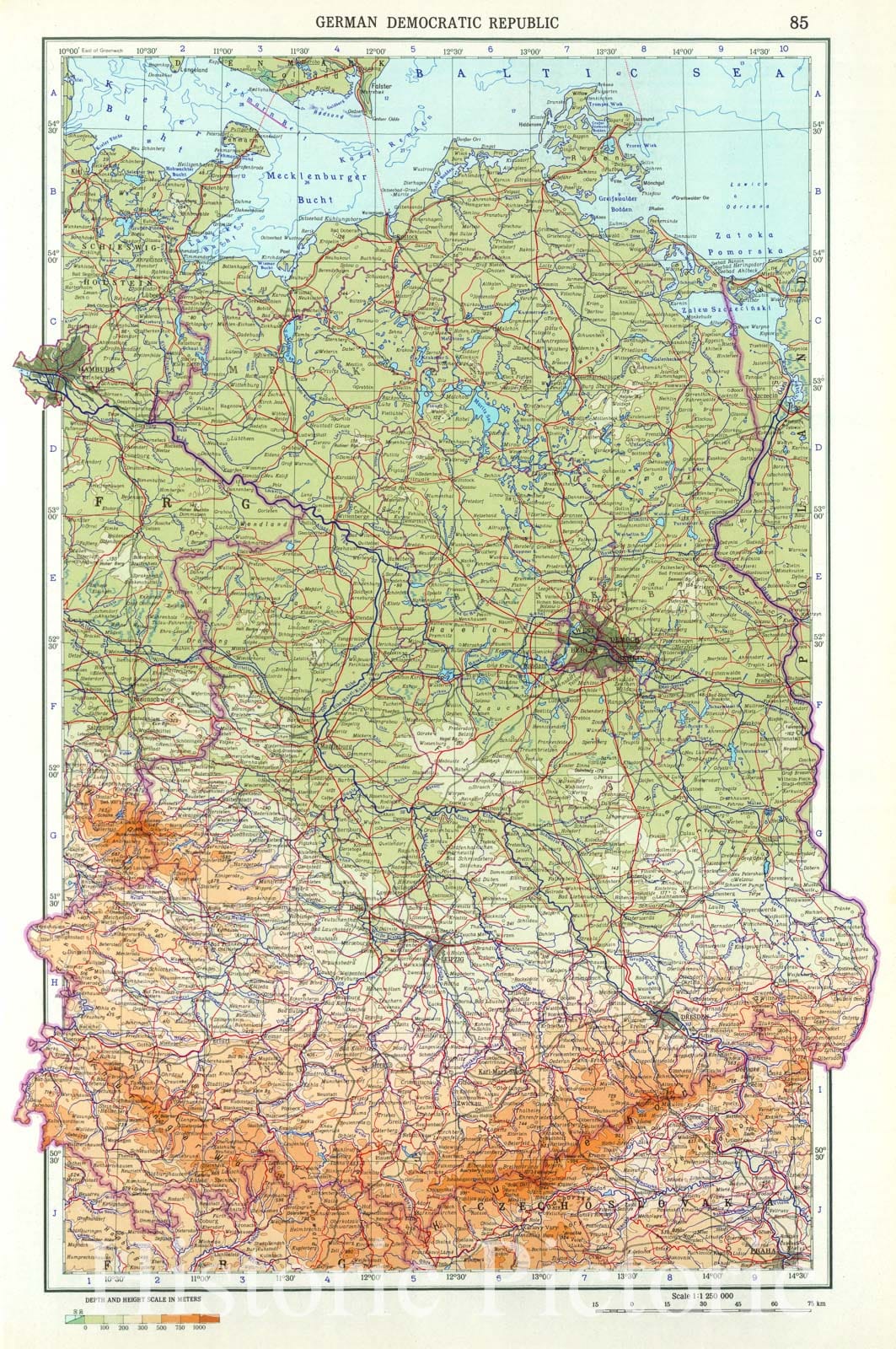 Historic Wall Map : 1967 85. German Democratic Republic (East Germany). The World Atlas. - Vintage Wall Art