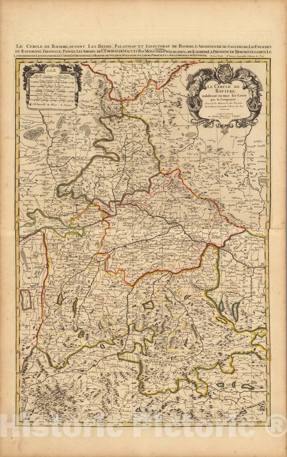 Le Cercle de Baviere. | Atlas Nouveau Contenant Toutes Les Parties du Monde, ou Sont exactement Remarques Les Empires, Monarchies, Royaumes, Estats, Republiques & Peuples qui fy trouuent a present. Par le Sr. Sanson, Geographe ordinaire du Roy. Presente a Monseigeur le Dauphin ... Hubert Jaillot Geographe du Roy. A Paris, Chez Hubert Jaillot .... | This issue of the Mortier/Jaillot Atlas Nouveau has 169 maps (1 more than the normal count of 168) plus diagrams, text pages, decorated titles and index pages. It is noted for the large number of multi-sheet "Theatre de la Guerre" (Theater of War) maps covering the battles raging in Europe and the Americas during the Spanish War of Succession (1701-1713) and the Northern War (1700-1721). The Atlas Nouveaux was first published by Jaillot in Paris in 1681(46 maps) with later issues by him in 1684 (72 maps) and 1689 (80 maps). In 1692 Pierre Mortier published his first edition of the Jaillot atlas with 99 maps, another edition followed in 1696 with 111 maps. In 1707/1708 Mortier issued our edition with 168 maps. Later editions by Mortier expanded the atlas even further - 1708, 200 maps; ca 1721, 300 maps; ca 1735, 400 maps. The atlas maps are large folio size with most maps made of two sheets and many maps combining 4 or 6 sheets (those also issued as wall maps separately). The atlas is most impressive for its large size and number of maps as well as being up to date for its time. This copy colored in outline with relief shown pictorially.