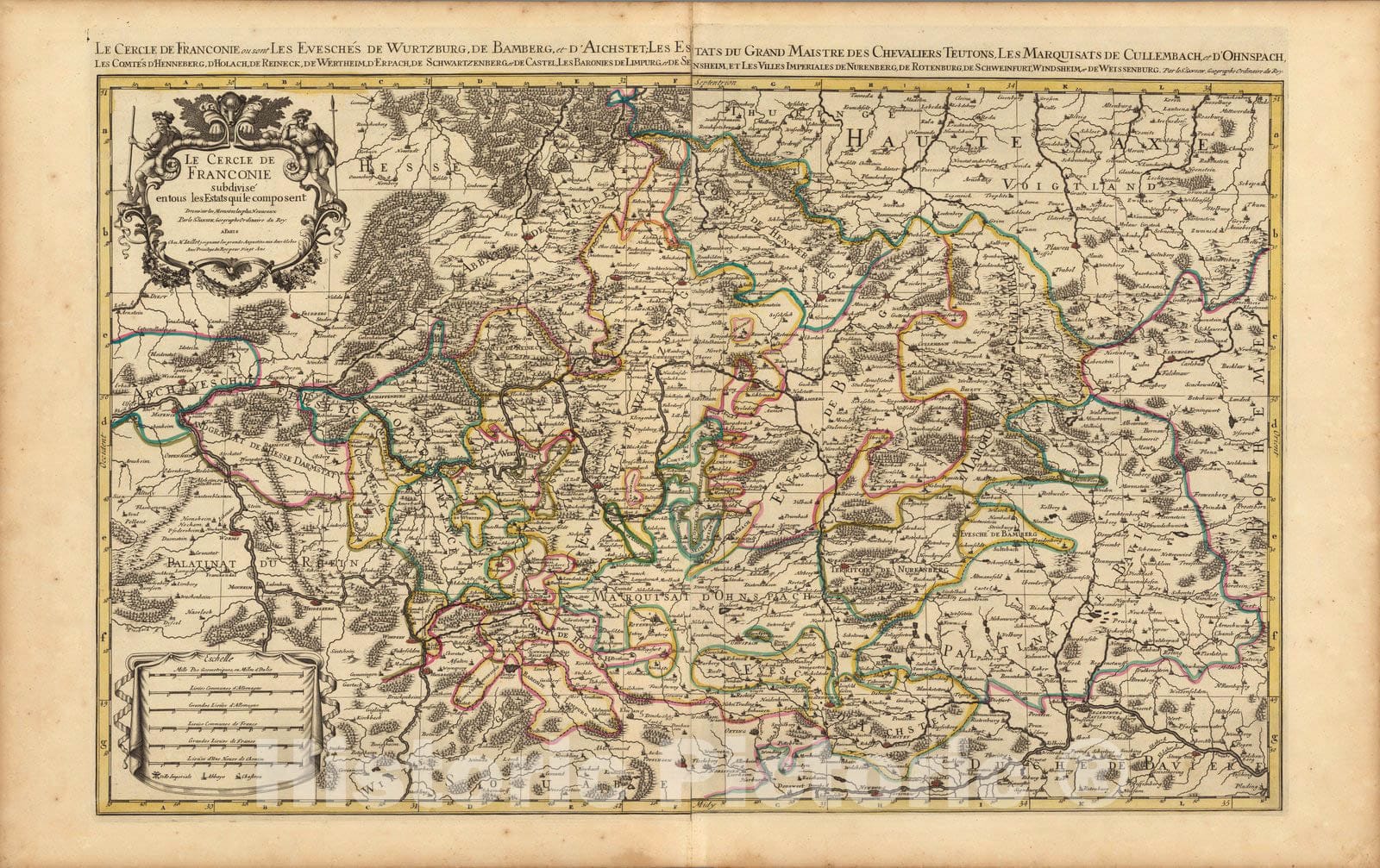Le Cercle de Franconie. | Atlas Nouveau Contenant Toutes Les Parties du Monde, ou Sont exactement Remarques Les Empires, Monarchies, Royaumes, Estats, Republiques & Peuples qui fy trouuent a present. Par le Sr. Sanson, Geographe ordinaire du Roy. Presente a Monseigeur le Dauphin ... Hubert Jaillot Geographe du Roy. A Paris, Chez Hubert Jaillot .... | This issue of the Mortier/Jaillot Atlas Nouveau has 169 maps (1 more than the normal count of 168) plus diagrams, text pages, decorated titles and index pages. It is noted for the large number of multi-sheet "Theatre de la Guerre" (Theater of War) maps covering the battles raging in Europe and the Americas during the Spanish War of Succession (1701-1713) and the Northern War (1700-1721). The Atlas Nouveaux was first published by Jaillot in Paris in 1681(46 maps) with later issues by him in 1684 (72 maps) and 1689 (80 maps). In 1692 Pierre Mortier published his first edition of the Jaillot atlas with 99 maps, another edition followed in 1696 with 111 maps. In 1707/1708 Mortier issued our edition with 168 maps. Later editions by Mortier expanded the atlas even further - 1708, 200 maps; ca 1721, 300 maps; ca 1735, 400 maps. The atlas maps are large folio size with most maps made of two sheets and many maps combining 4 or 6 sheets (those also issued as wall maps separately). The atlas is most impressive for its large size and number of maps as well as being up to date for its time. This copy colored in outline with relief shown pictorially.