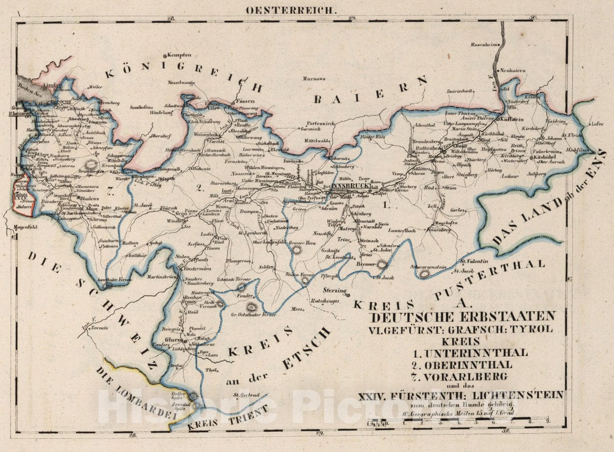 Oesterreich. A. Deutsche Erbstaaten. Vl. Gefurst:Grafsch: Tyrol Kreis ... XXIV. Furstenth: Lichtenstein ... (to accompany) Atlas von Europa nebst den Kolonien. Leipzig bei Georg Joachim Goschen 1828. | Atlas von Europa nebst den Kolonien : fur Geschaftsmanner, Zeitungsleser und Besitzer des Conversations-Lexicons in einer Folge von Charten und einem alphabetisch eingerichteten Texte : bearbeitet von W. E. A. v. Schlieben ... Leipzig bei Georg Joachim Goschen 1825. O. Hermann, Lith. | Publisher:Georg Joachim Goschen