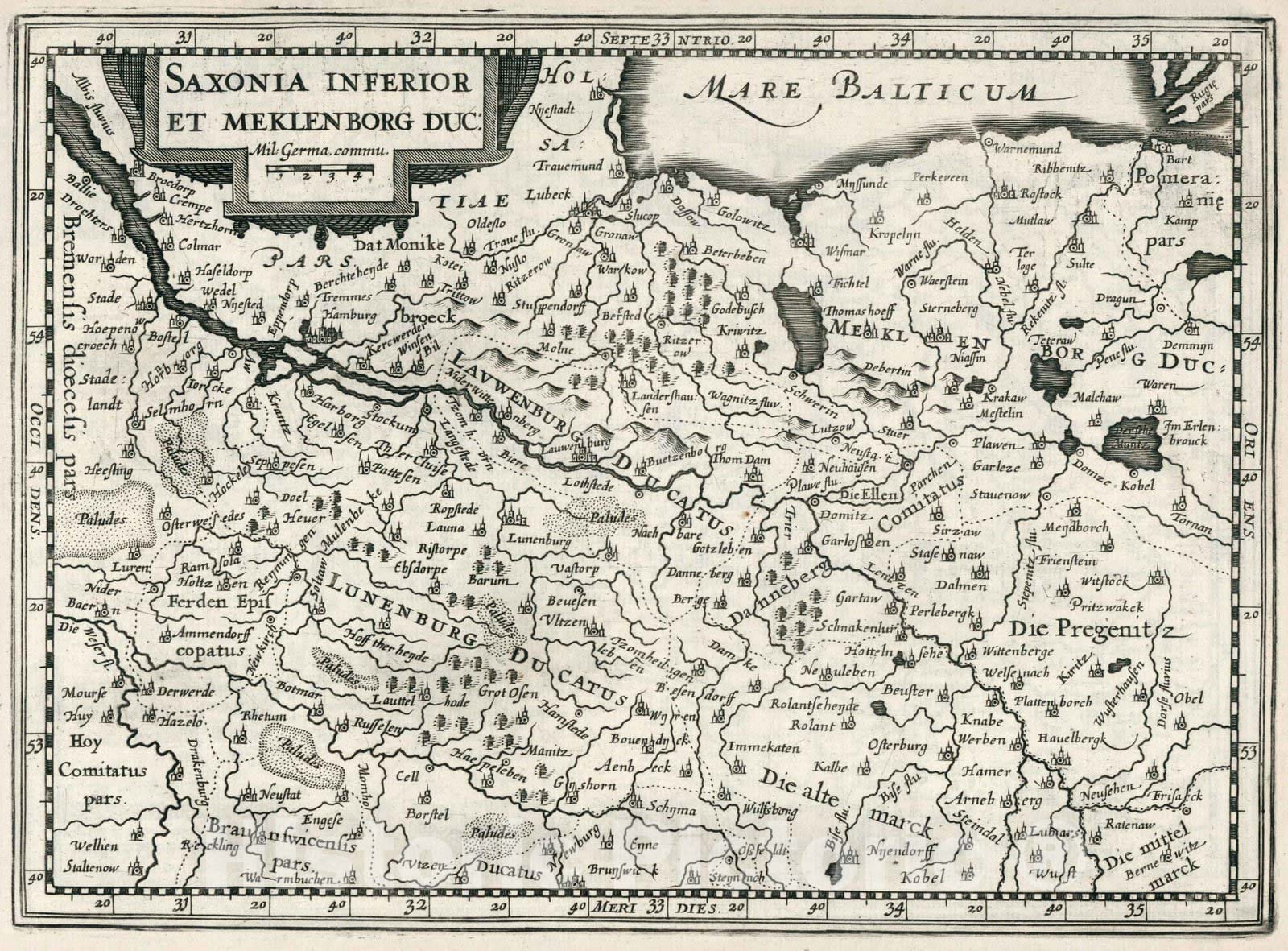 Historic Wall Map : Germany,Saxonia Inferior Et Meklenborg Duc. 1636 , Vintage Wall Art