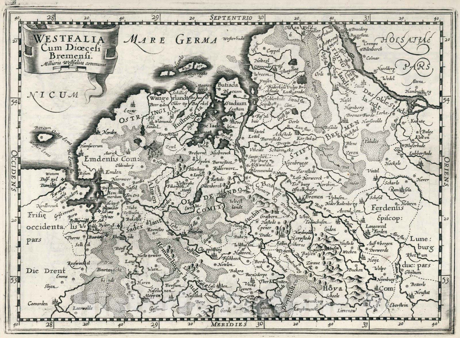 • Historic Wall Map : Germany,Westfalia Cum Dioecesi Bremensi 1636 , Vintage Wall Art