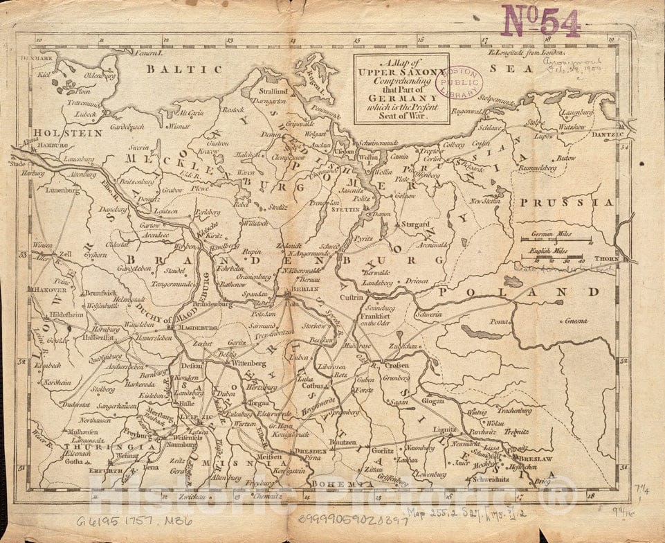 Historical Map, 1757 A map of Upper Saxony comprehending That Part of Germany which is The Present seat of war, Vintage Wall Art