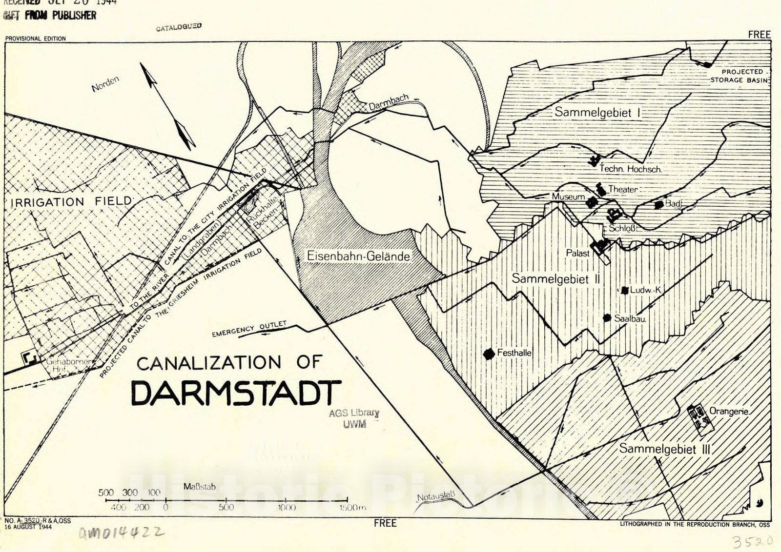• Map : Darmstadt, Germany 1944, Canalization of Darmstadt , Antique Vintage Reproduction