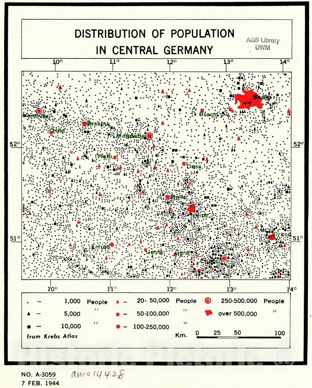 • .Map : Germany 1944, Distribution of Population in Central Germany, Antique Vintage Reproduction