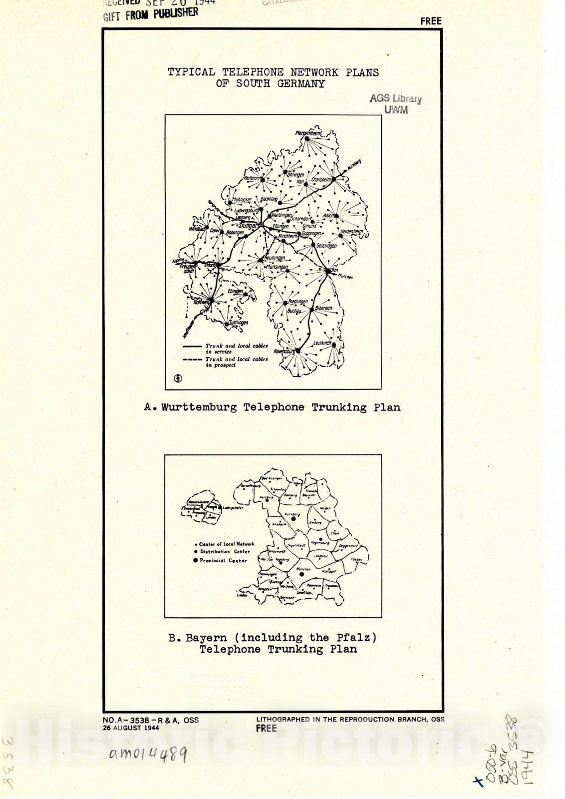 Map : Germany, southern 1944, Typical telephone network plans of south Germany , Antique Vintage Reproduction