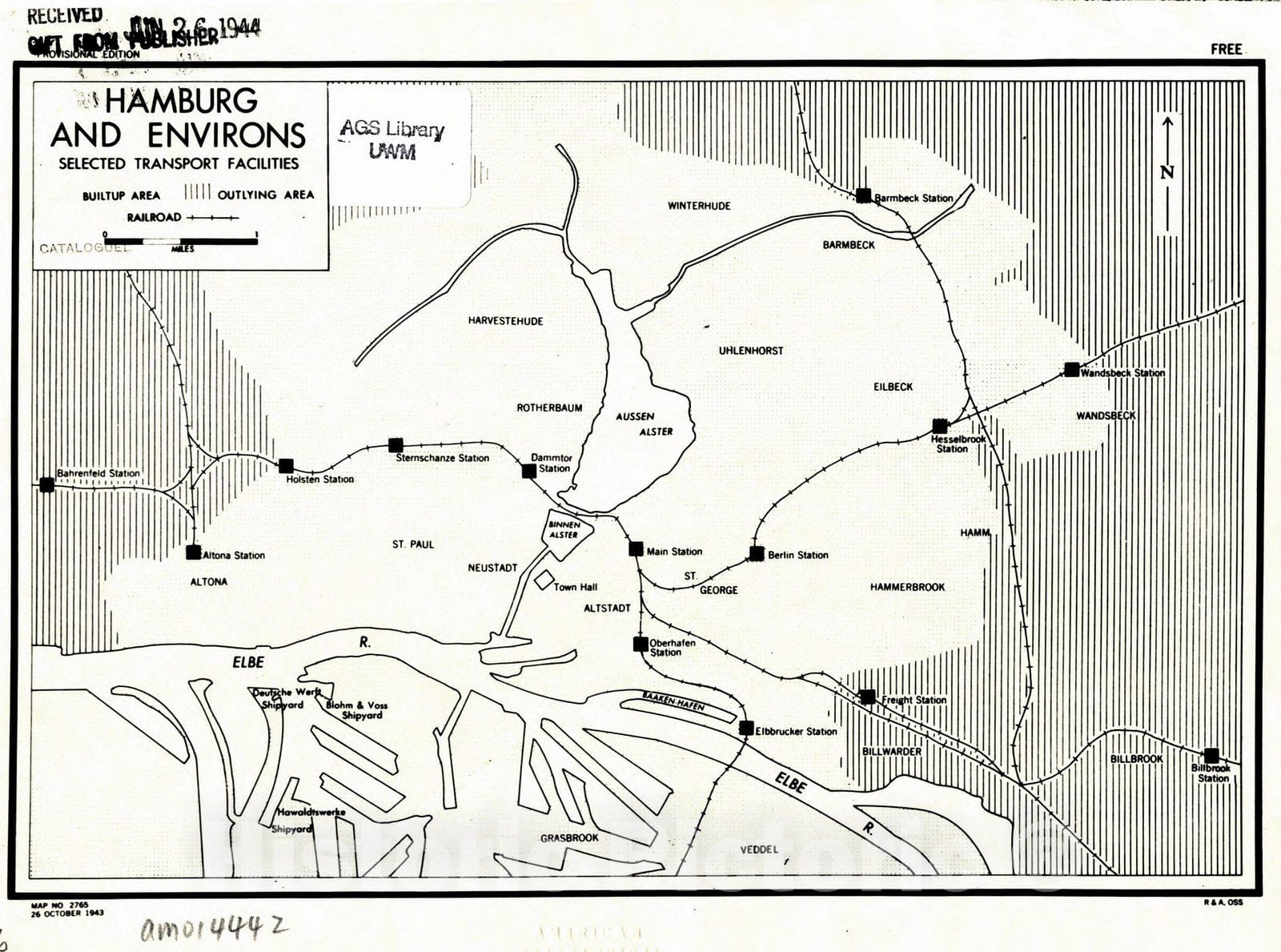 Map : Hamburg, Germany 1943, Hamburg and environs : selected transport facilities , Antique Vintage Reproduction