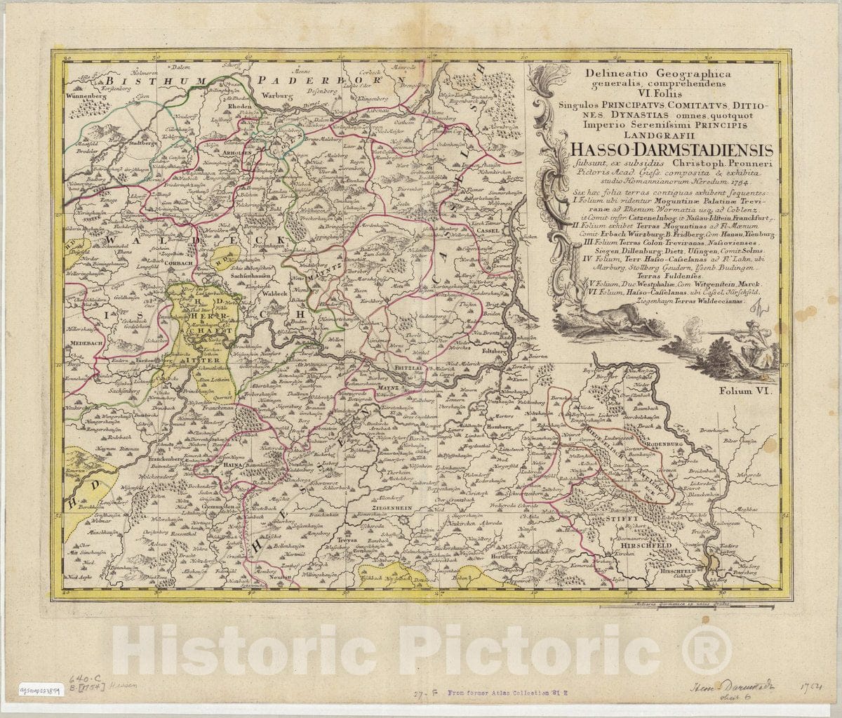 Delineatio geographica generalis, comprehendens VI. foliis : singulos principatus, comitatus, ditiones, dynastias omnes quotquot imperio serenissimi principis landgrafii Hasso-Darmstadiensis / subsunt, ex subsidiis Christoph. Pronneri pictoris Acad. Gi
