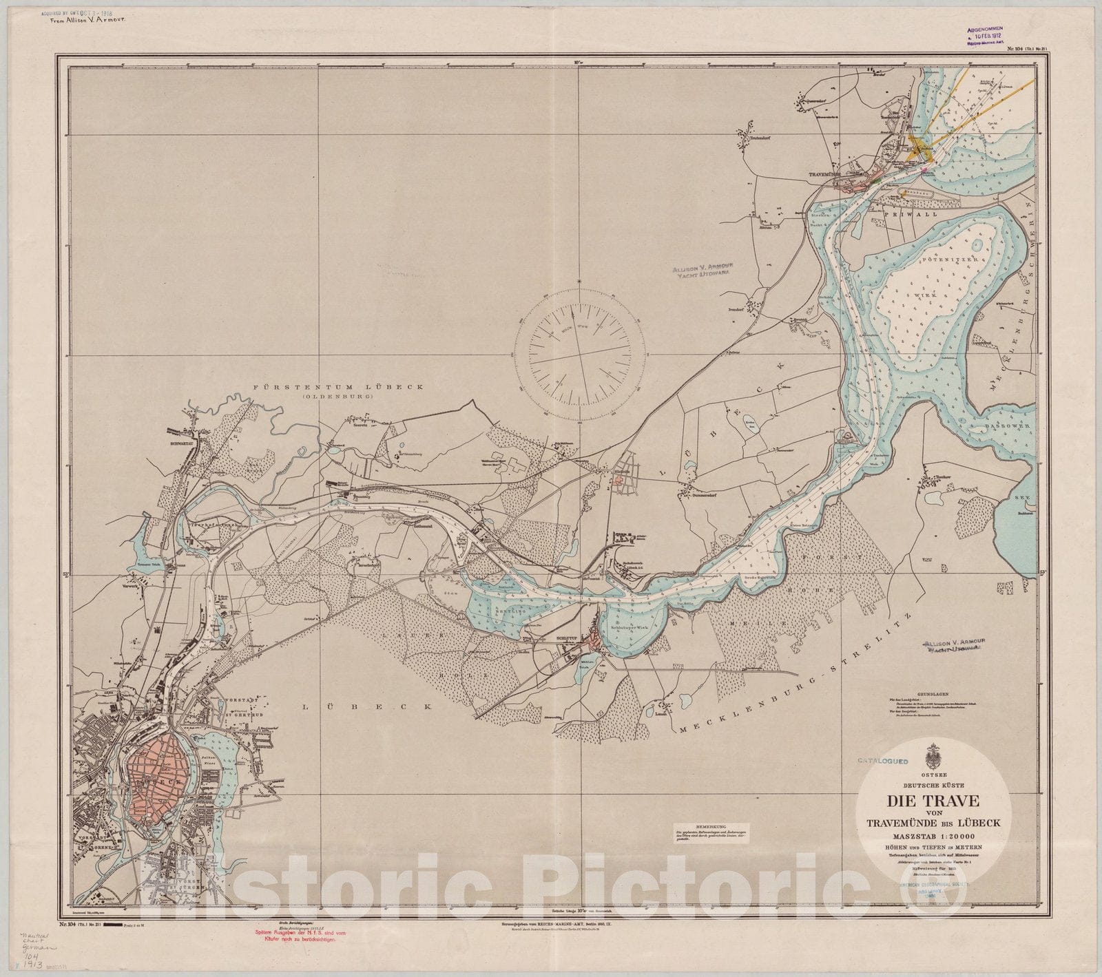 Map : Trave River, Germany 1913, Ostsee, Deutsche kuste : Die Trave von Travemunde bis Lubeck , Antique Vintage Reproduction