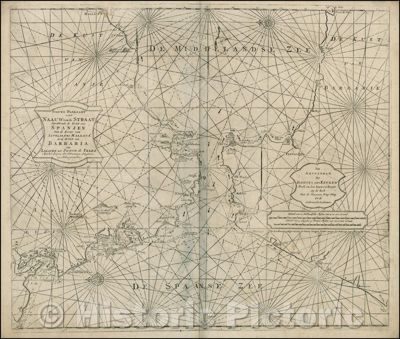 Historic Map - Nieuwe Paskaart van't Naauw van de Straat Strekkende :: Straits of Gibraltar, St. Lucar,Cadiz, Spain,Malaga, Sebu River,Larache, 1730 - Vintage Wall Art