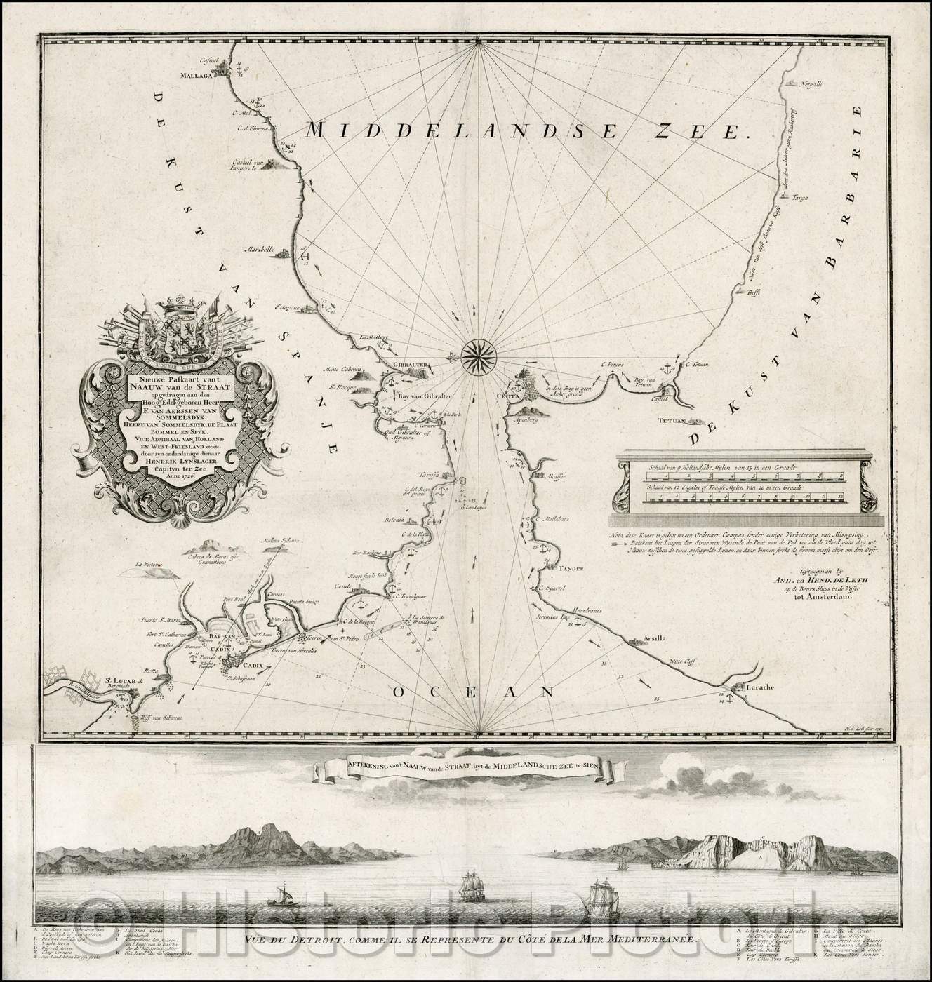 Nieuwe Paskaart vant Naauw van de Straat. op gedragen aan den Hoog Edel / Chart and View the Straits of Gibraltar, east at the top, 1726