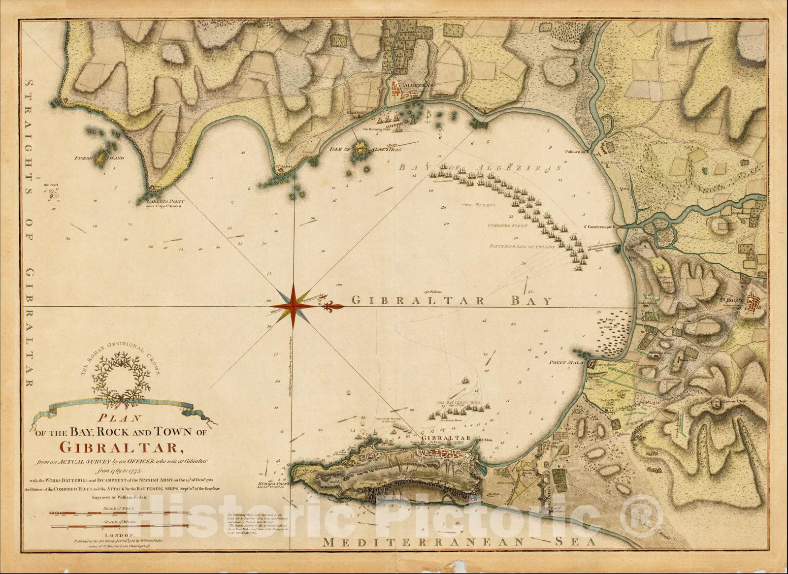 • .Historic Map : Plan of the Bay, Rock and Town of Gibraltar, 1783, William Faden, Vintage Wall Art