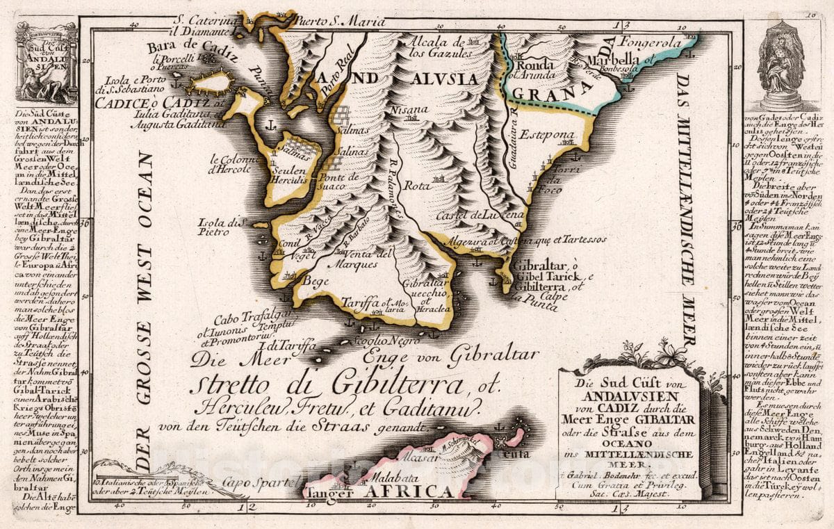 Historic Map : Spain, Gibraltar, Strait of, Europe 1704 Die Sud Cust von Andalusien von Cadiz durch die Meer Enge Gibaltar , Vintage Wall Art
