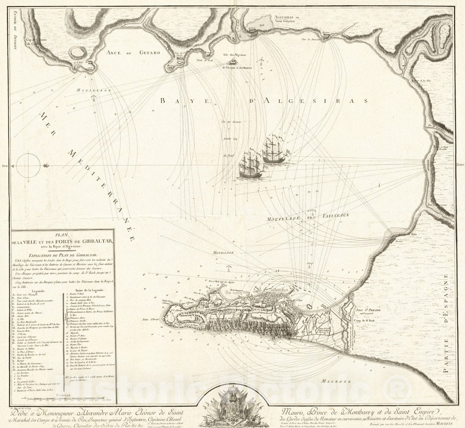Historical Map, 1782 Plan de la Ville et des forts de Gibraltar, avec la Baye d'Algesiras, Vintage Wall Art