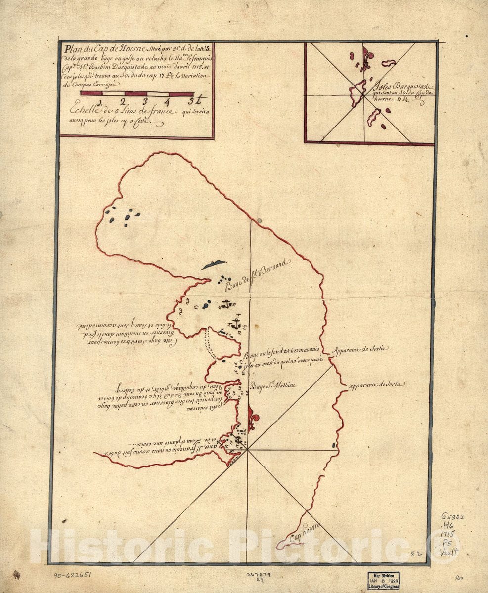 Historic 1715 Map - Plan du Cap de Hoorne situé par 56. d. de latt. S. de la Grande Baye ou golfe ou relacha le Nare. le françois Capne. Mr. Ioachim Darquistade au Mois d'avril 1715