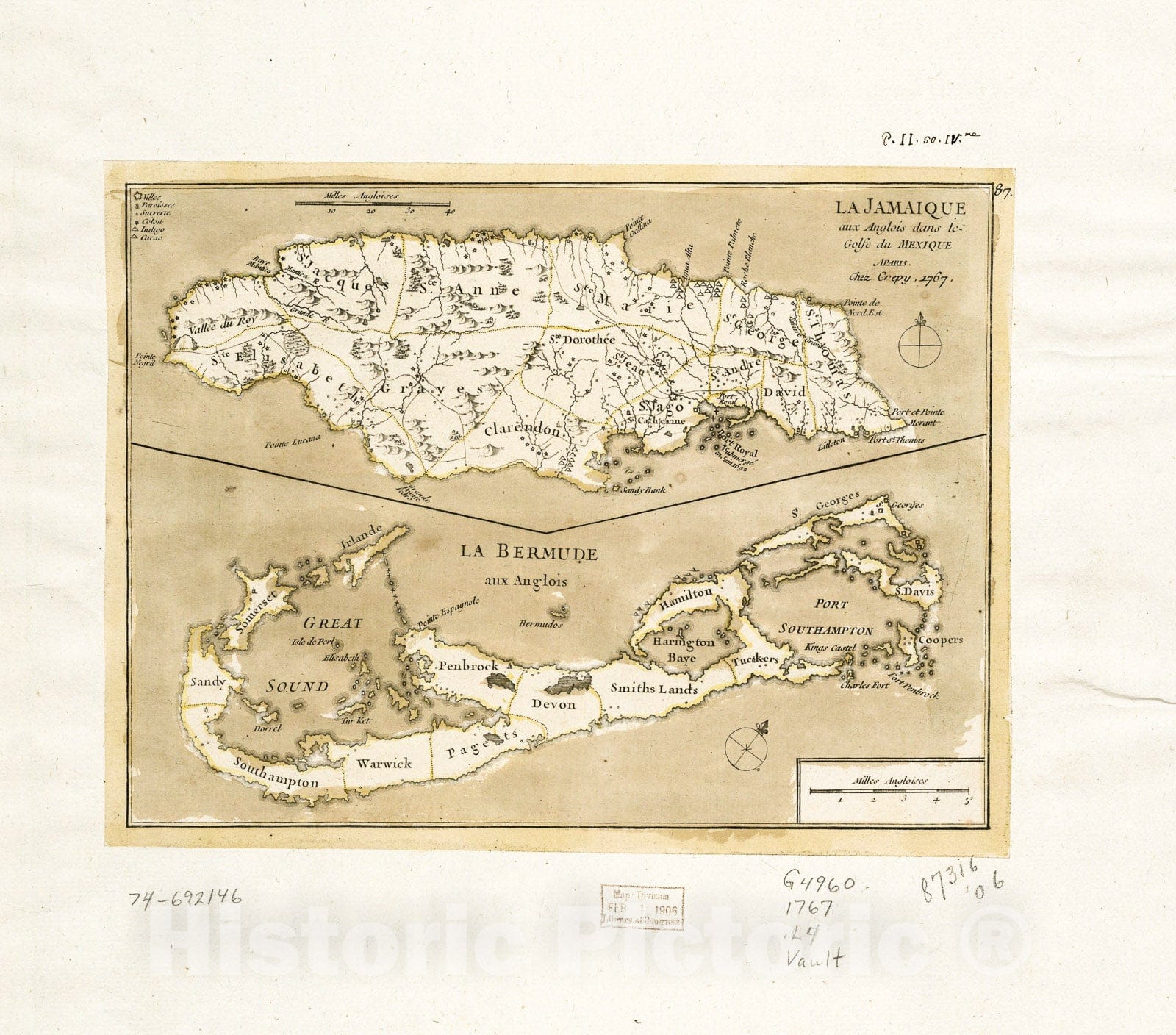 Historic 1767 Map - La Jamaique aux angolis Dans le Golfe du Mexique. La Bermude aux anglois.