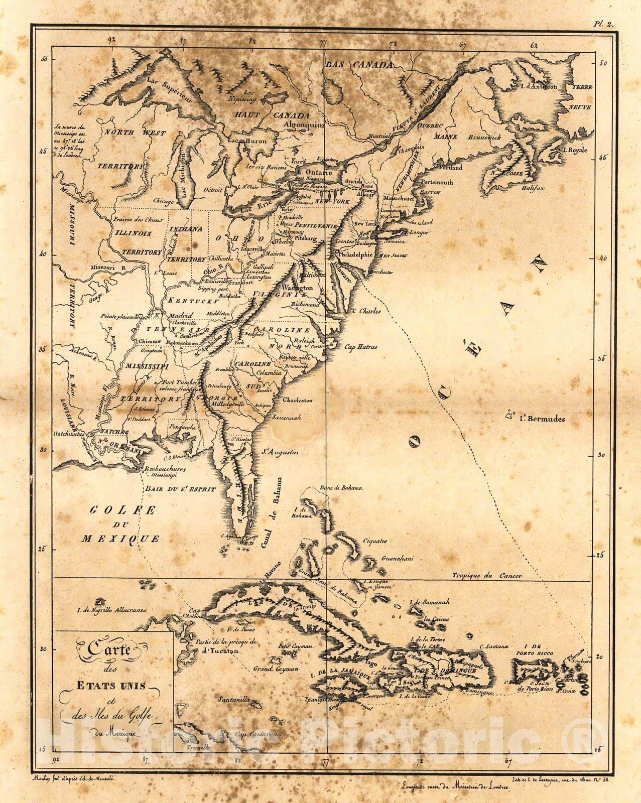 Historic Map : 1821 Carte de États-Unis et des Fles du Golfe du Mexique : Vintage Wall Art