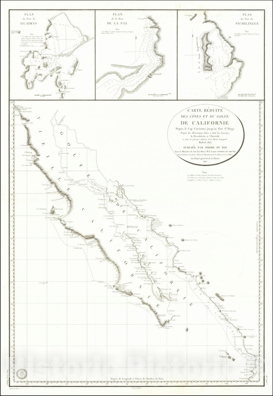 • .Historic Map : Carte Reduite Des Cotes et du Golfe De Californie Depis le Cap Corrientes jusqu'au Port St. Diego, 1826, 1826, Depot de la Marine, v2, Vintage Wall Art