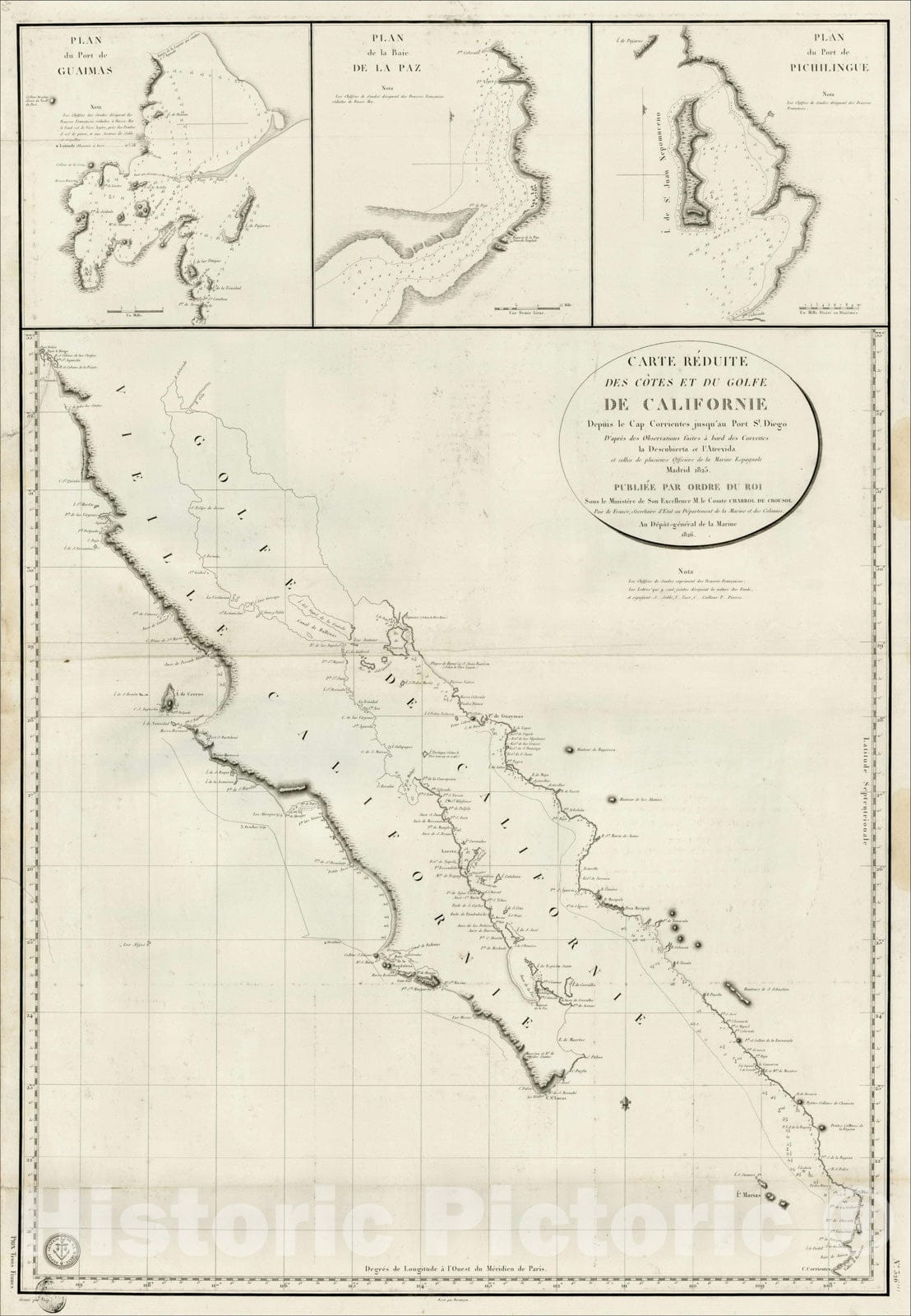 Historic Map : Carte Reduite Des Cotes et du Golfe De Californie Depis le Cap Corrientes jusqu'au Port St. Diego, 1826, 1826, Depot de la Marine, v1, Vintage Wall Art