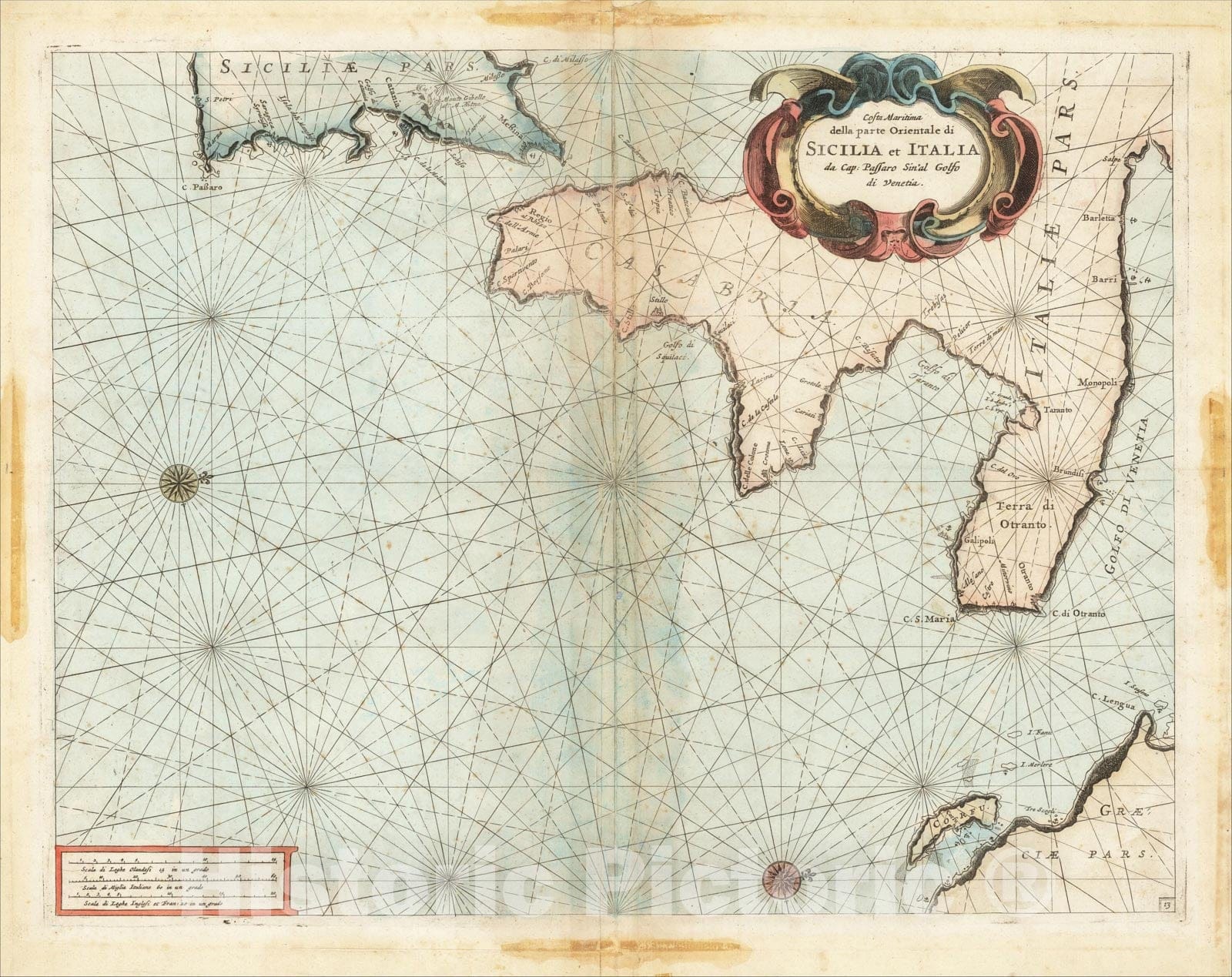 • .Historic Map : Costa Maritima della parte Orientale di Sicilia et Italia da Cap: Passaro Sin'al Golfo di Venetia, 1695, Vincenzo Maria Coronelli, Vintage Wall Art