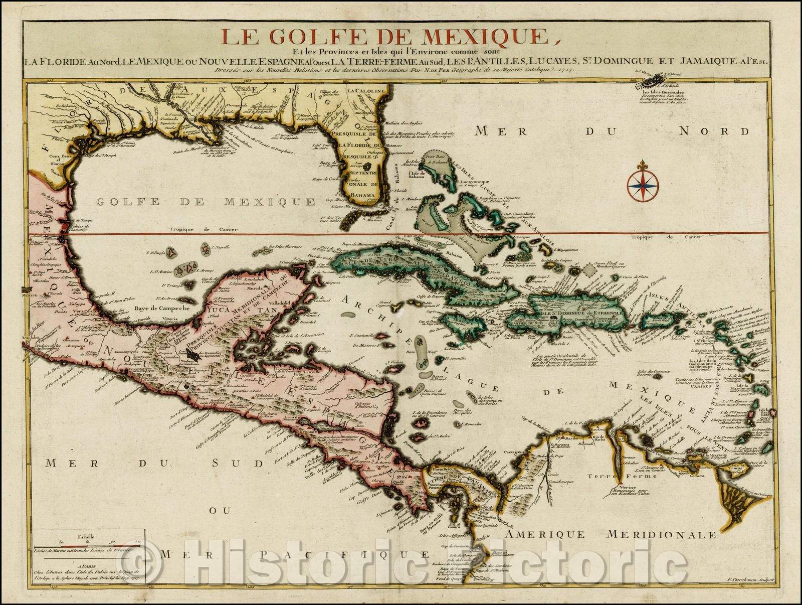 • .Historic Map - Le Golfe De Mexique, La Floride Au Nord Le Mexique ou Nouvelle Espagne/The Gulf Of Mexico, Florida In North Mexico or New Spain. 1717, 1717 - Vintage Wall Art