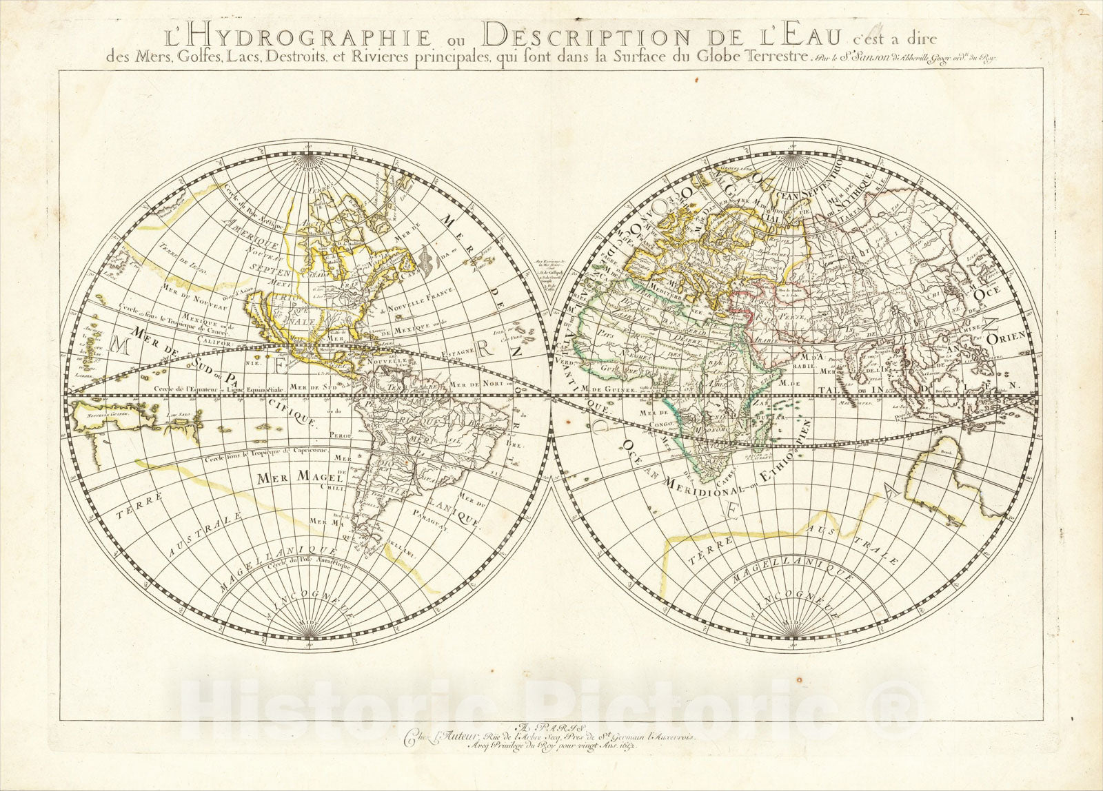 Historic Map : L'Hydrographie ou Descriprion de L'Eau c'est a dire des Mers, Golfes, Lacs, Destroits, et Rivieres principales, 1652, Nicolas Sanson, Vintage Wall Art