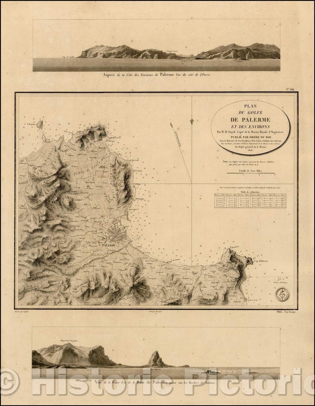 Plan Du Golfe De Palerme Et Des Environs Par W.H. Smyth / Plan of the Gulf of Palermo, with two Views of the approaches to the Bay , 1826
