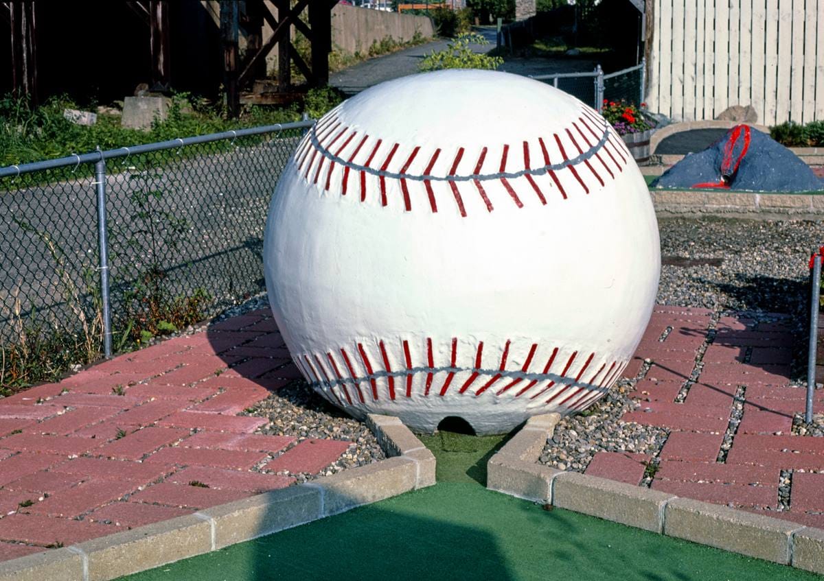 Historic Photo : 1984 Giant baseball hole, Salute to the USA mini golf, Lake Winnipesaukee Pier, Weirs Beach, New Hampshire | Photo by: John Margolies |