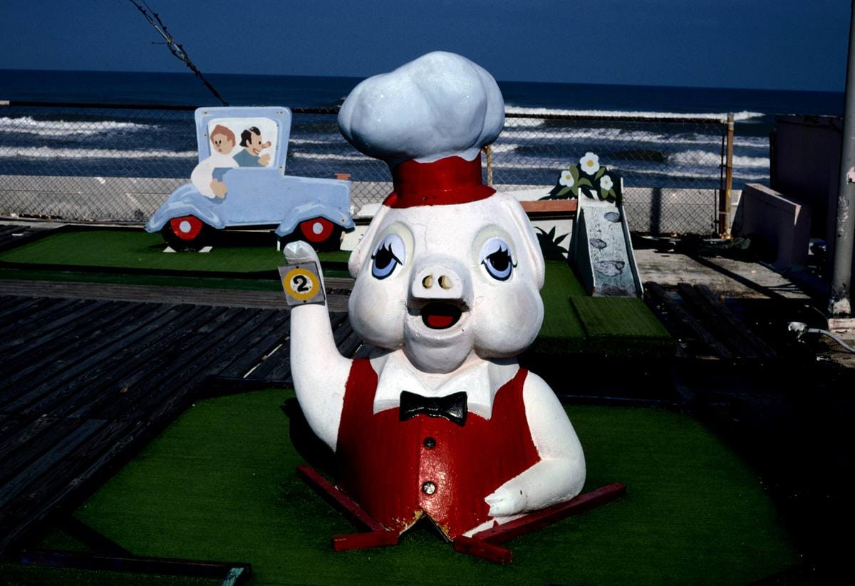 Historic Photo : 1990 Pig chef and auto, Joyland Golf, Daytona Beach, Florida | Margolies | Roadside America Collection | Vintage Wall Art :
